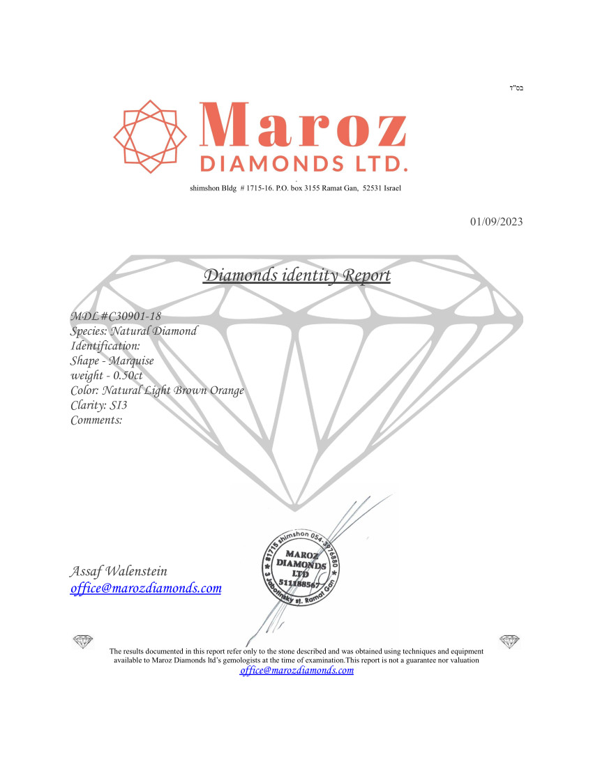 DIAMANTE 0,5 CARATI COLORE CHIARO MARRONE ARANCIO - TAGLIO MARCHESE - CERTIFICATO GEMMOLOGICO MAROZ DIAMONDS LTD MEMBRO ISRAEL DIAMOND EXCHANGE - C30901-18