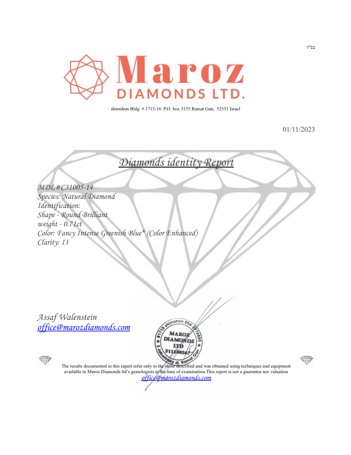 DIAMANTE COLORE ESALTATO 0,71 CARATI - COLORE FANCY BLU VERDOGONOLO INTENSO - PUREZZA I3 - TAGLIO BRILLANTE - CERTIFICATO GEMMOLOGICO MAROZ DIAMONDS LTD MEMBRO ISRAEL DIAMOND EXCHANGE - C31005-14