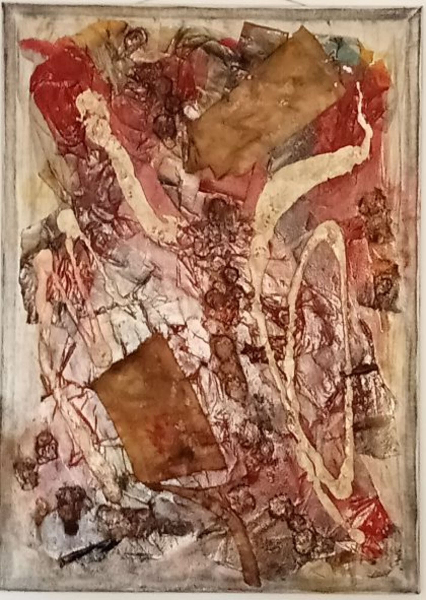 MATERIALE: carbone, patchwork tessuti, carta, organico e stucco liquefatto