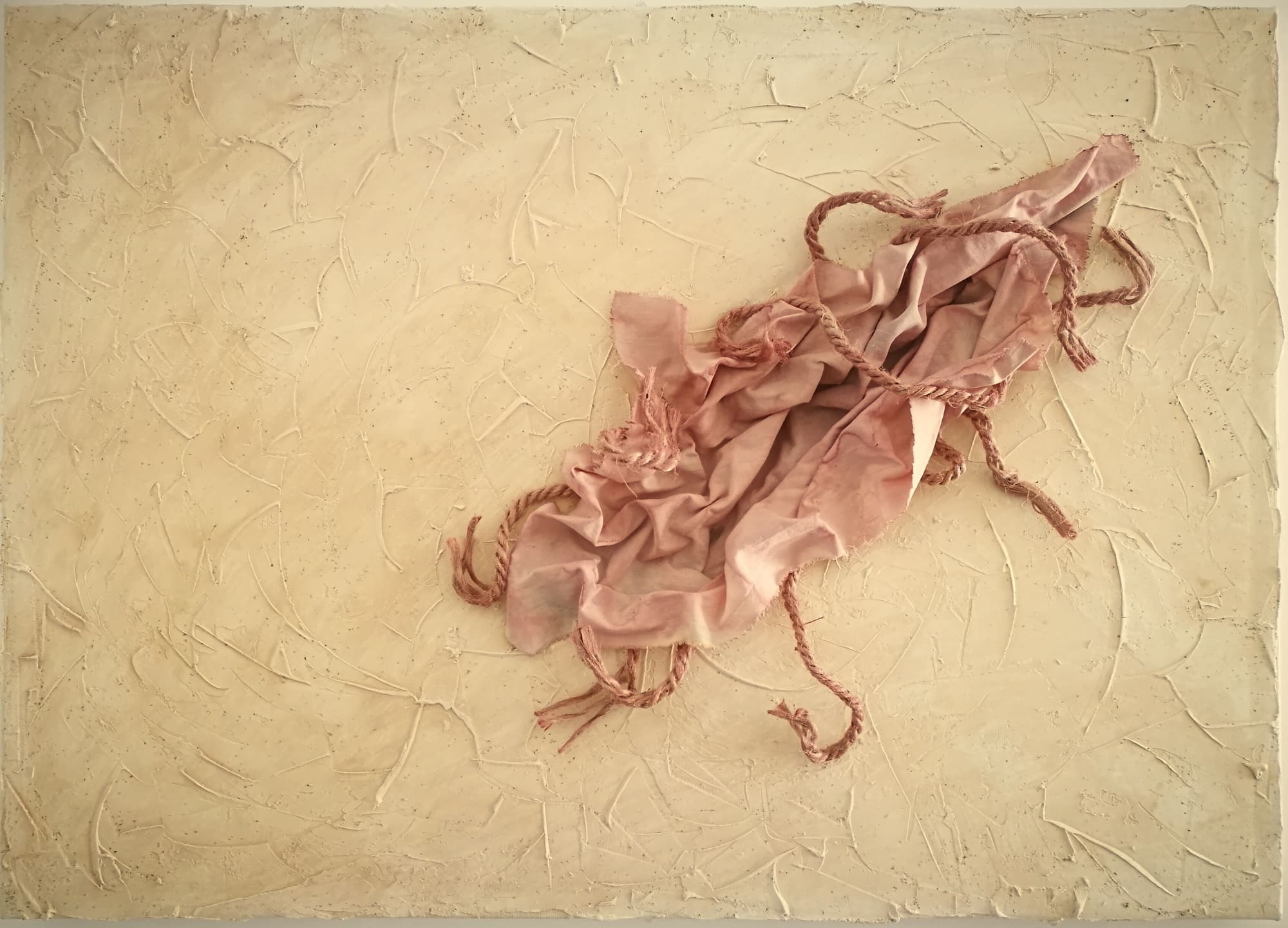 MATERIALE: stucco spatolato e tamponato con il thé, taglio obliquo da dove fuoriesce tessuto e spago colorato con thé ai frutti di bosco