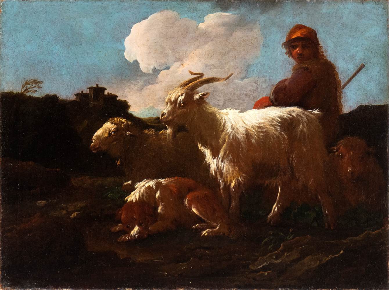 a) Pastore con capre e cane; b) Pastorella con capre e cane. Coppia di dipinti Olio su tela cm. 48x63,5 cad.