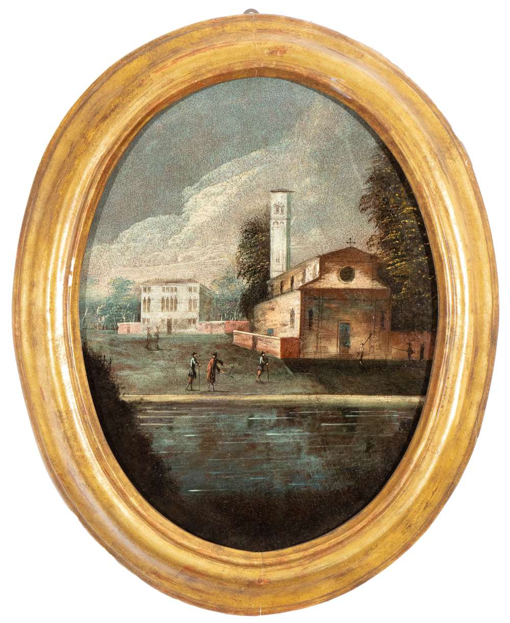 Artista veneto, XVIII secolo () Paesaggio lagunare con chiesa Olio su tela...