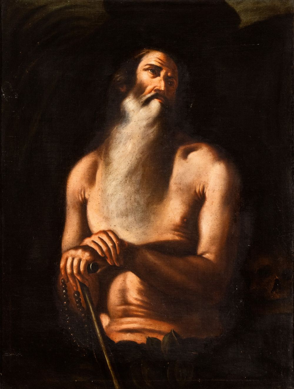 Artista napoletano, XVII secolo () Eremita con bastone e rosario Olio su tela...