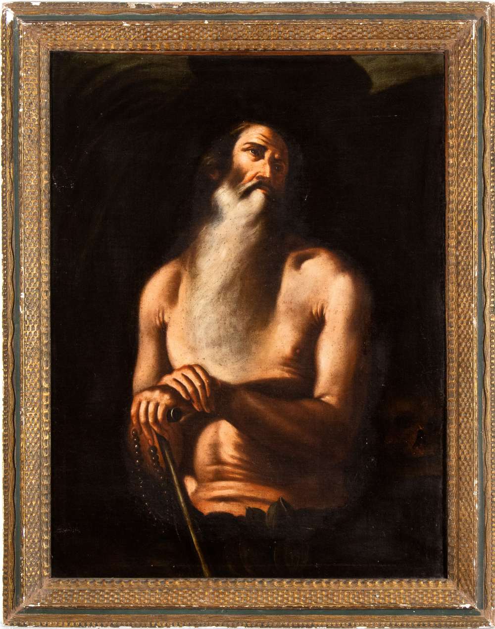 Lotto 84 | Artista napoletano, XVII secolo () Eremita con bastone e rosario Olio su tela...
