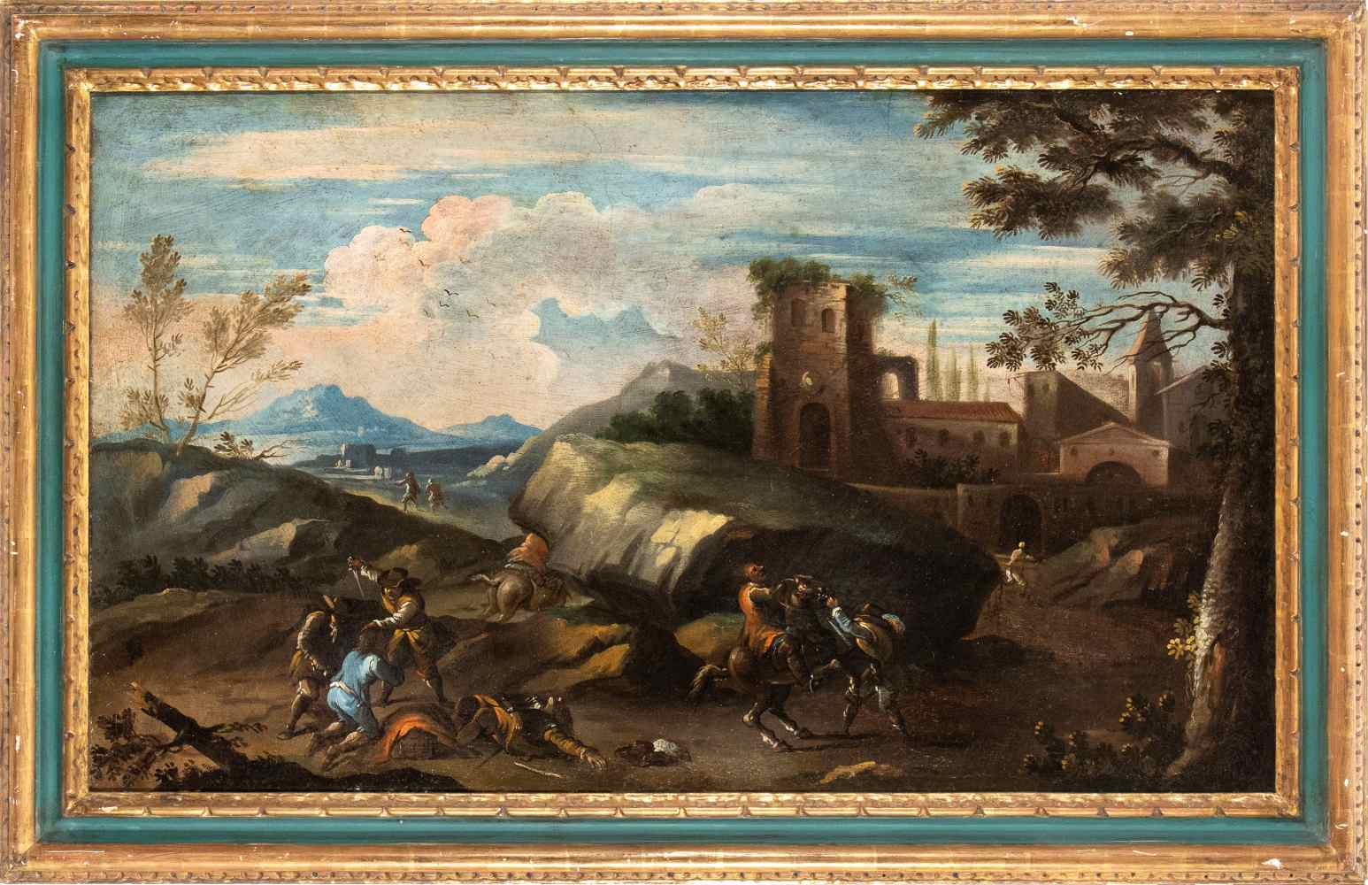Paesaggio con agguato e cittadella sullo sfondo Olio su tela cm. 69x115. Con cornice