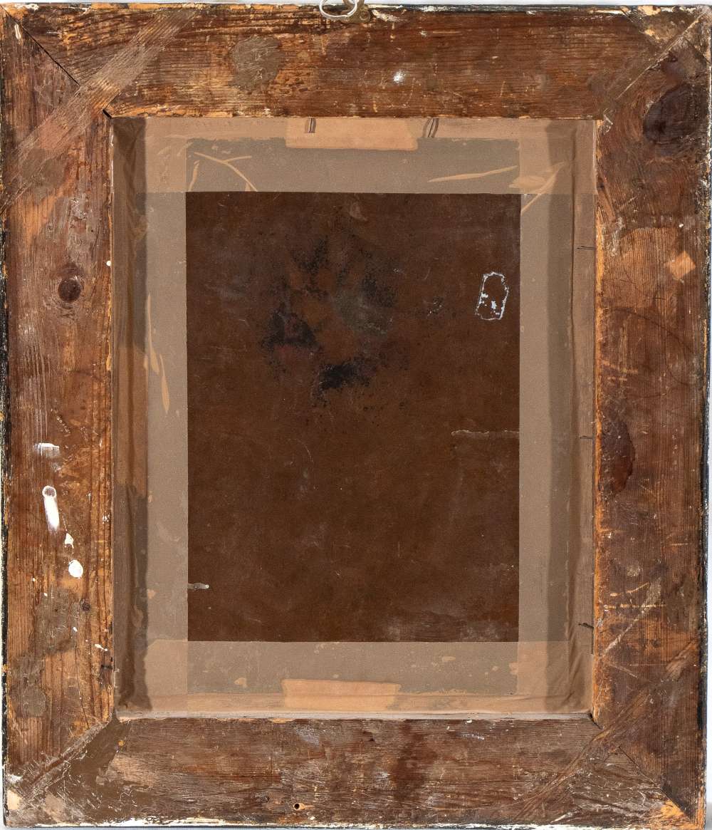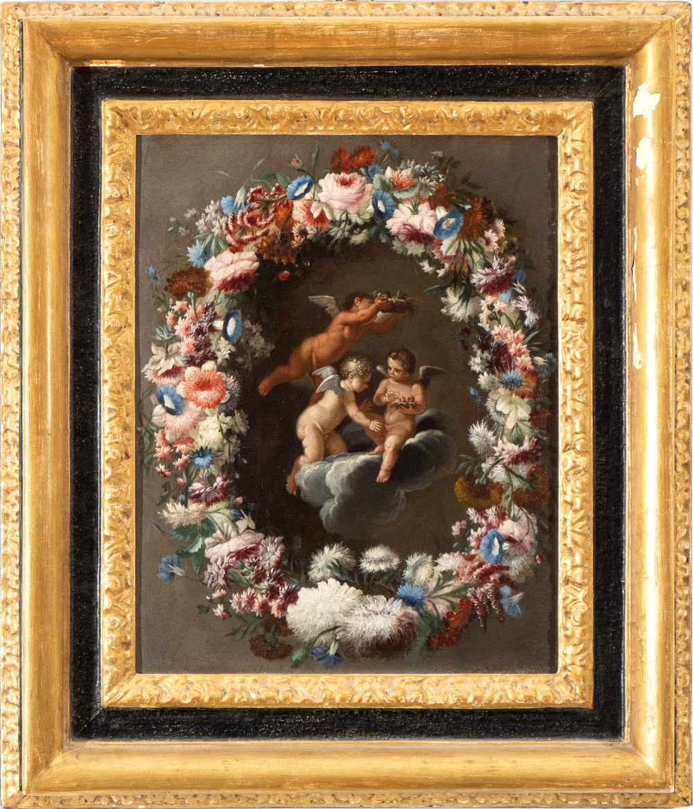Ghirlanda di fiori con putti Olio su rame cm. 40,5x32. Con cornice