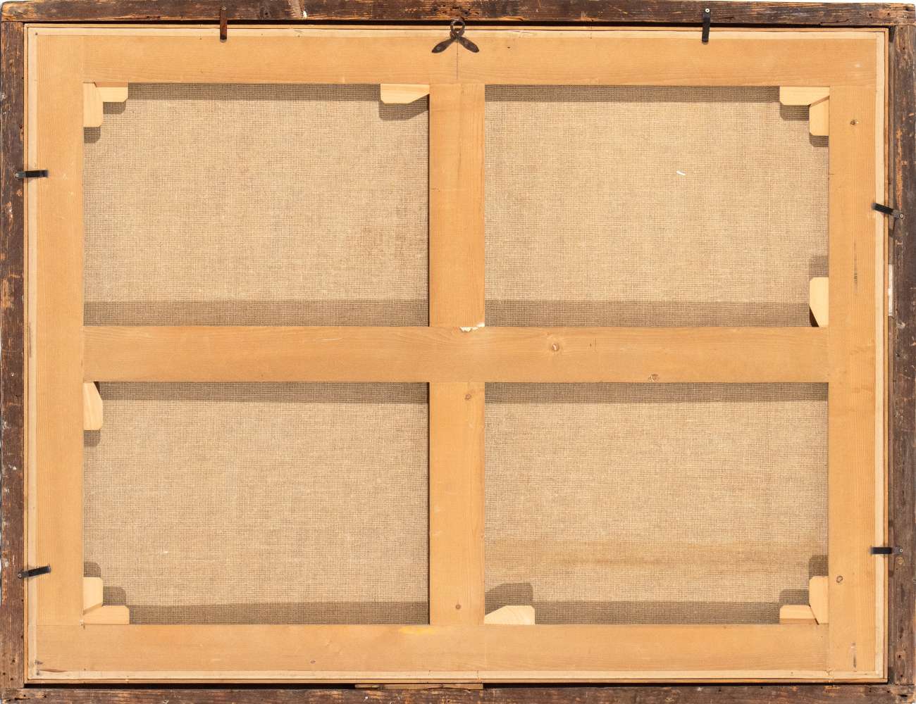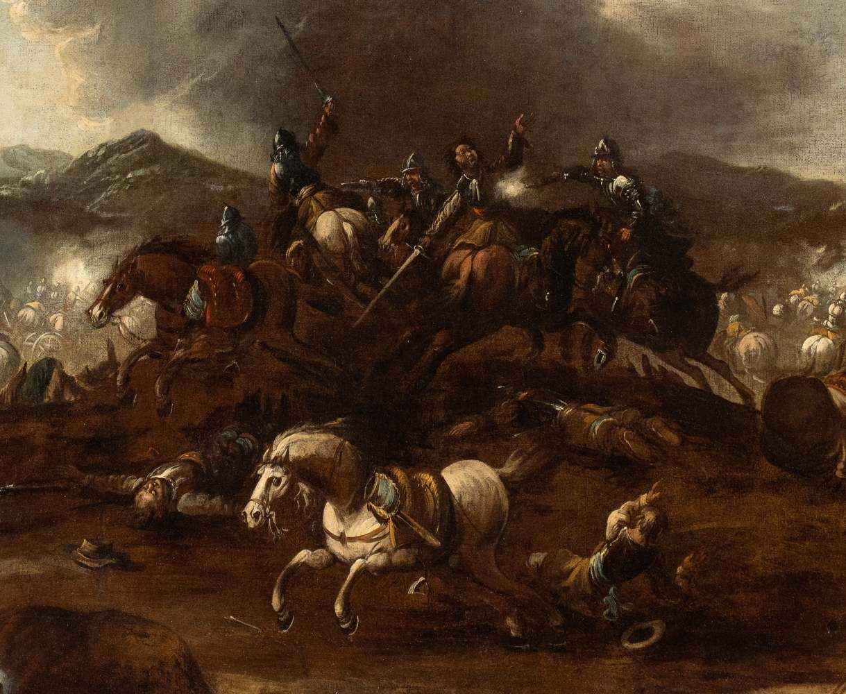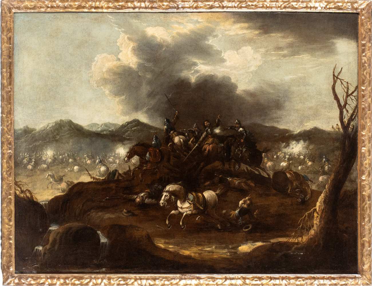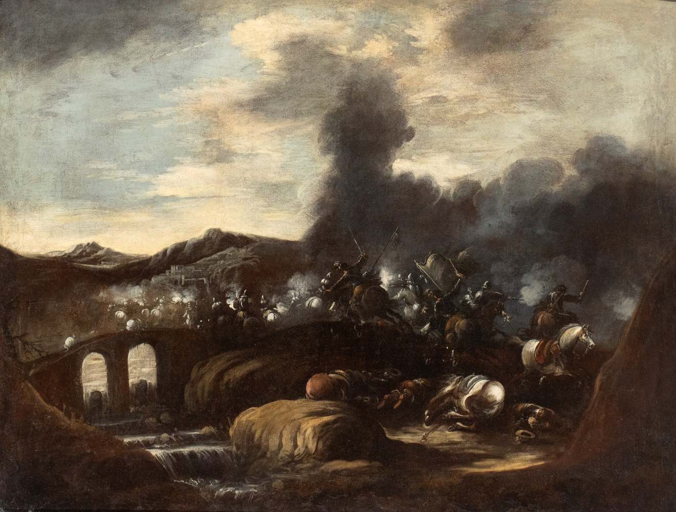 a) Scontro di cavallerie in campo aperto; b) scontro di cavallerie nei pressi di un ponte. Coppia di dipinti Olio su tela cm. 93x123 cad. Con cornice