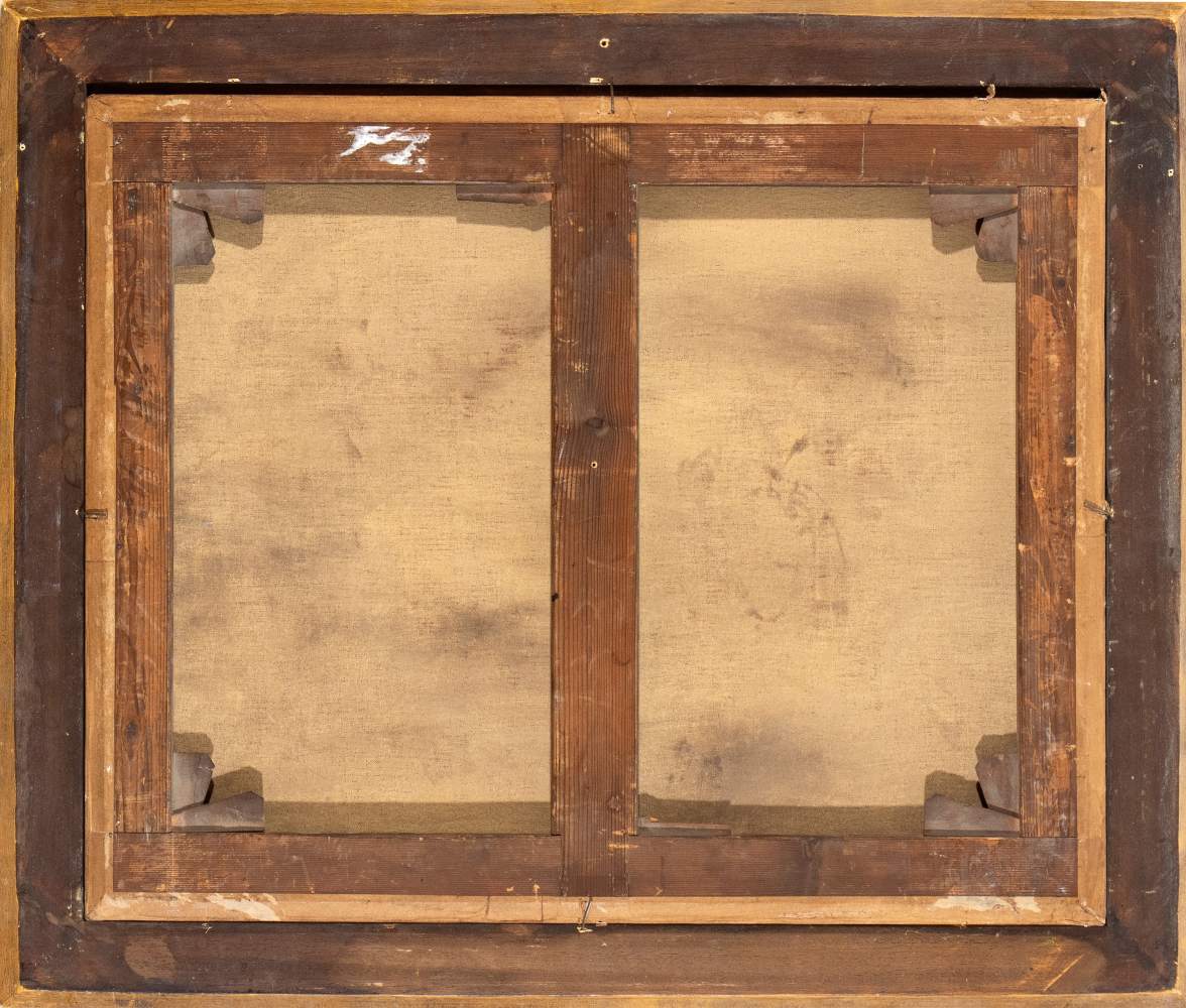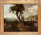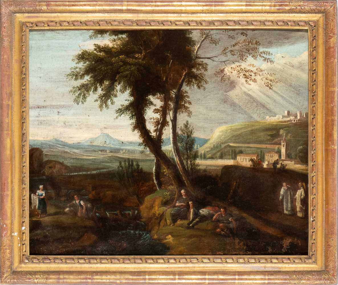Paesaggio con sosta di viandanti, monaci e lavandaie presso un torrente Olio su tela cm. 59,5x73,5. Con cornice