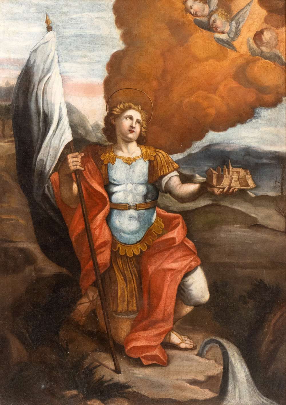 Artista emiliano, XVIII secolo () Santo guerriero con modello di cittadella...