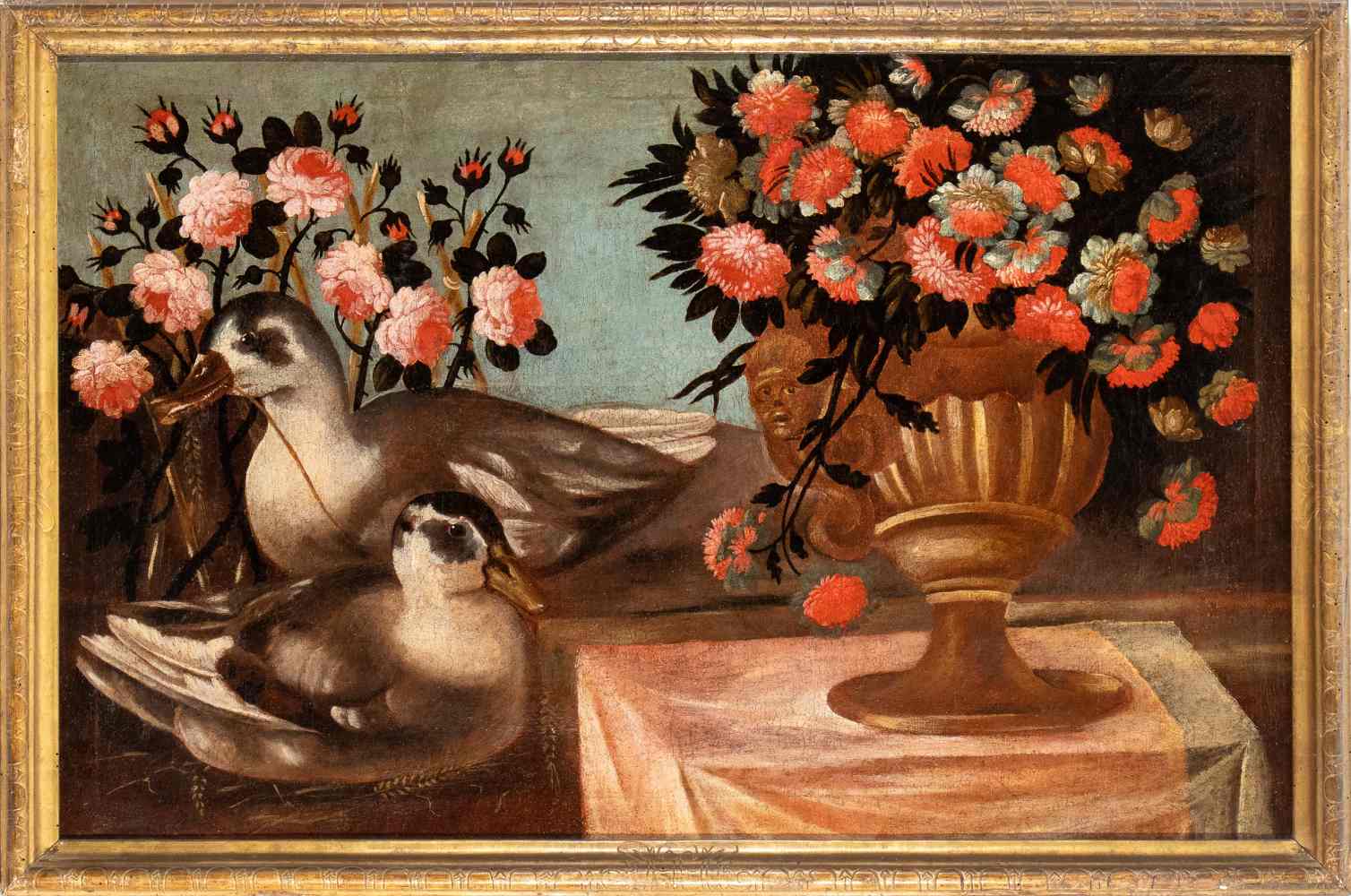 Artista centro-italiano, XVIII secolo () Natura morta di fiori con due papere...
