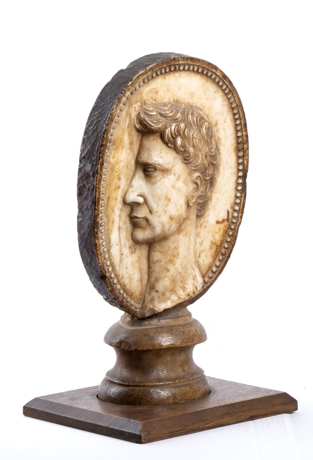 Medaglione con ritratto virile di profilo Scultura in marmo cm. 39x25x8. Con base in legno