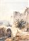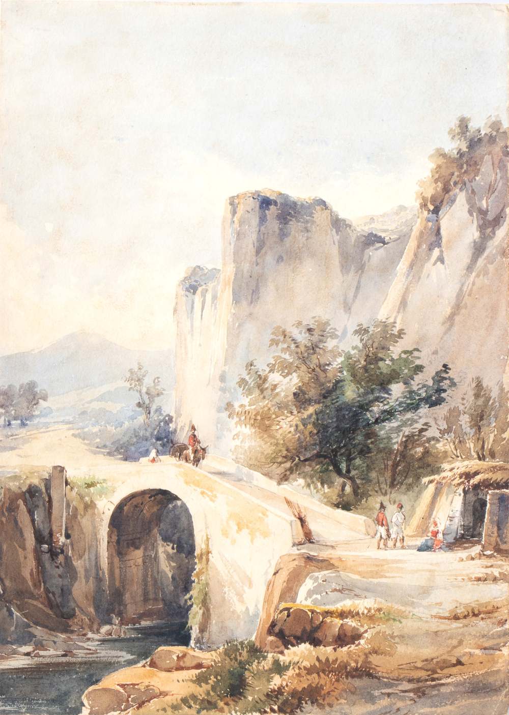 Veduta con ponte e personaggi in costumi tradizionali Tempera su carta cm. 36,5x25,5. Con cornice