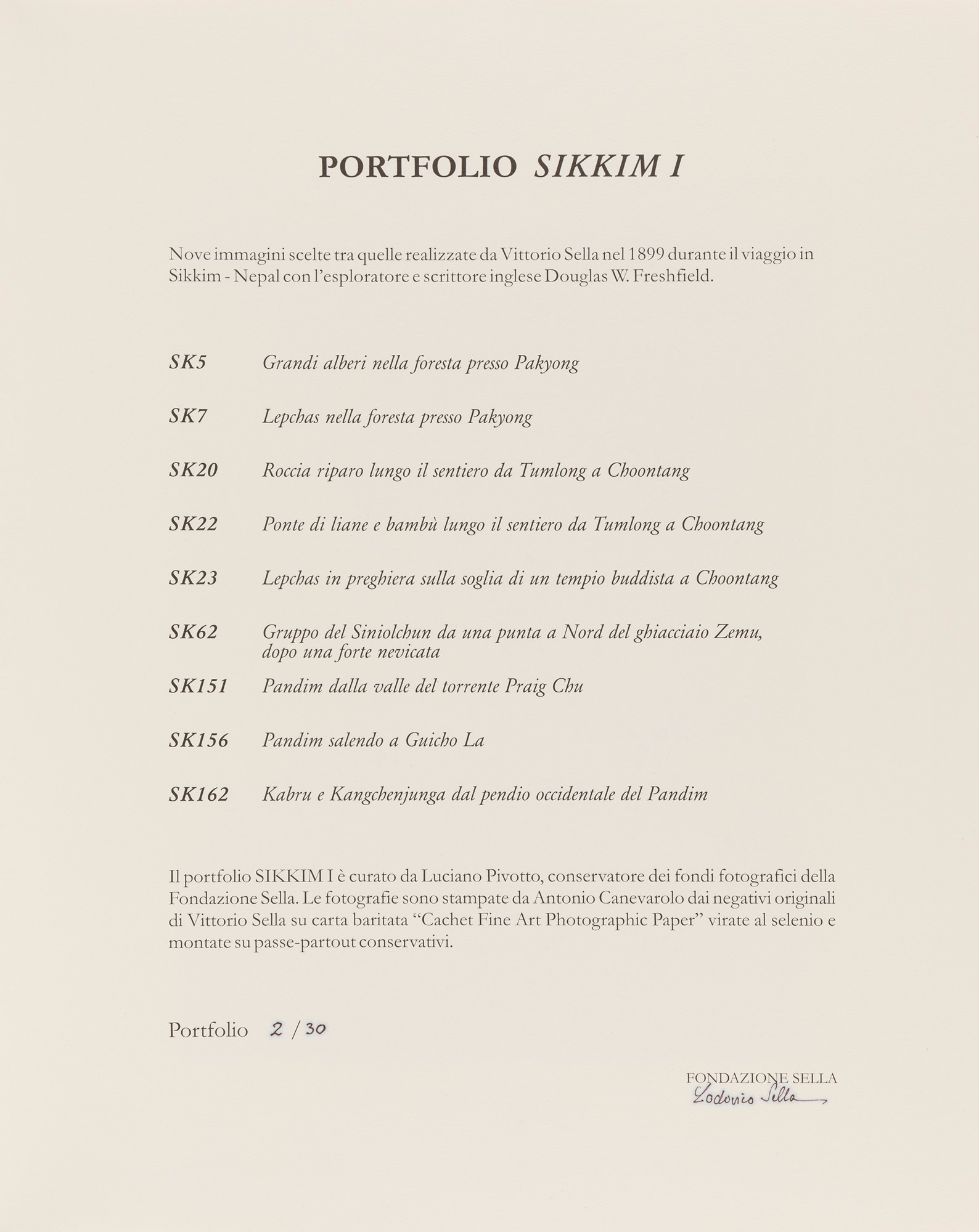 Del grande fotografo biellese, Vittorio Sella, si possono nella stessa misura apprezzare da un lato la capacità di affrontare un tema inedito alla fine dell'Ottocento come quello della fotografia delle montagne e dall'altra la minuziosa precisione con cui realizzava le sue stampe. Per realizzare quelle opere che sarebbero poi state definite con un neologismo “fotoalpinistiche”, bisognava essere degli apprezzabili scalatori anche considerando il fatto di dover muoversi con al seguito apparecchiature pesanti, poco maneggevoli come erano i banchi ottici di un tempo e fragili come le lastre in vetro che fungevano da negativi. Ma non è solo quel senso di grandiosità che traspare dalle sue immagini a rendere preziose le sue fotografie, ma anche la tecnica da lui stesso inventata grazie alla quale realizzava delle stampe particolarmente raffinate e preziose come si può constatare nelle fotografie qui proposte.