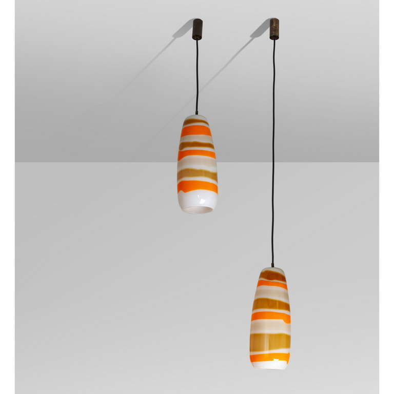 Vetro lattimo con decoro a fasce orizzontali policrome.