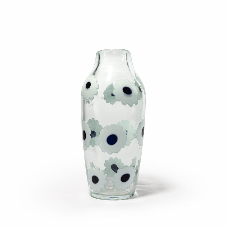 Un vaso in cristallo con decoro di margherite lattimo e nero incluse.