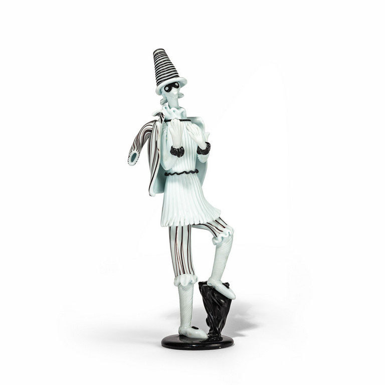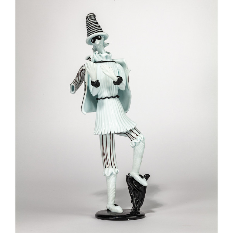 Figura della Commedia dell'Arte in vetro lattimo e nero.