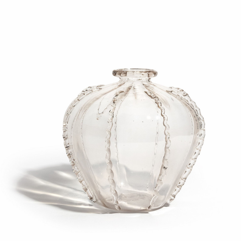 Un vaso in cristallo soffiato a coste con applicazione di morisette.