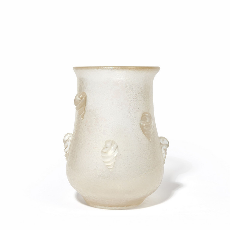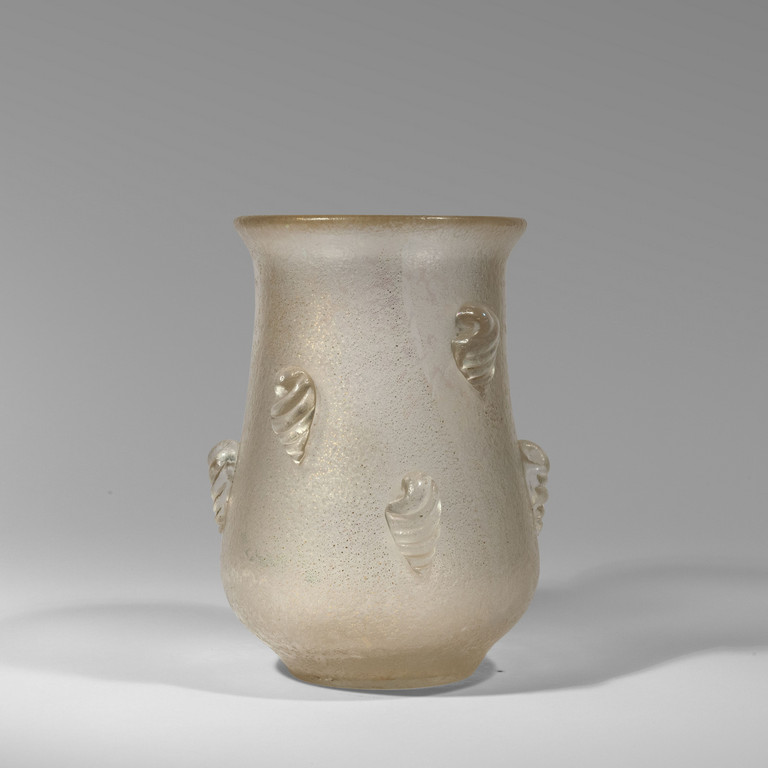 Un vaso in cristallo corroso e foglia oro con applicazione di conchiglie.