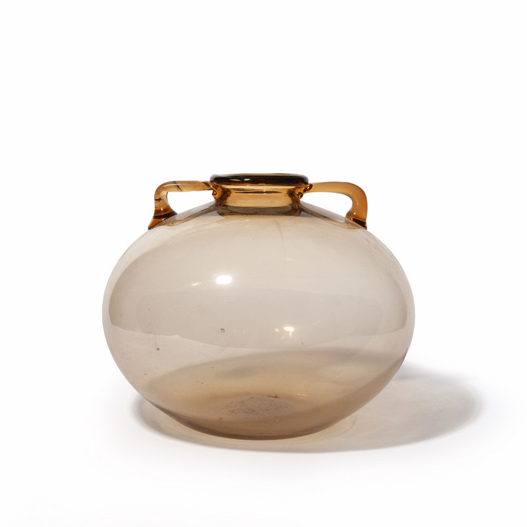 Un grande vaso in vetro soffiato ambra e due anse applicate.