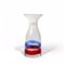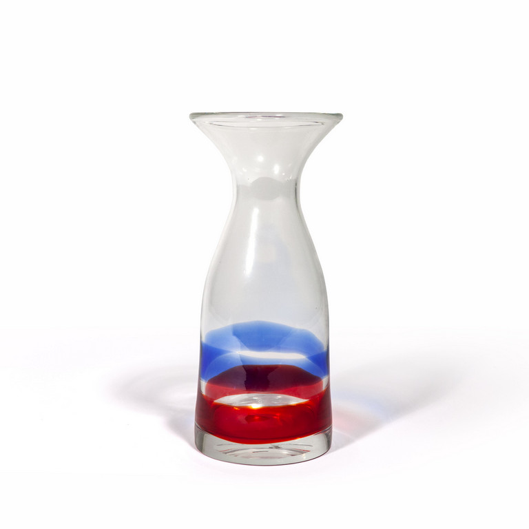 Una bottiglia in vetro trasparente decorata a fasce orizzontali blu e rosse.