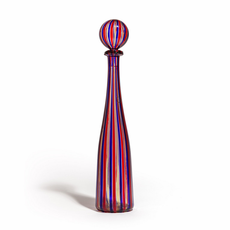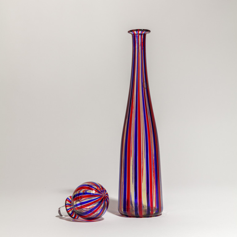 Una bottiglia a canne verticali blu rosse e pagliesco.