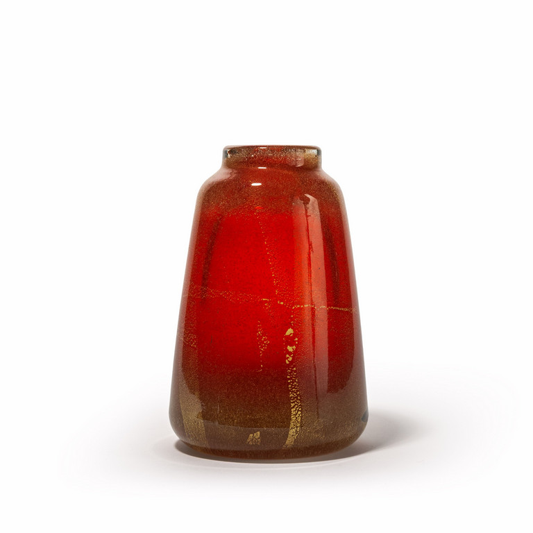 Un vaso modello '3563' in vetro sommerso rosso a bollicine e foglia oro.