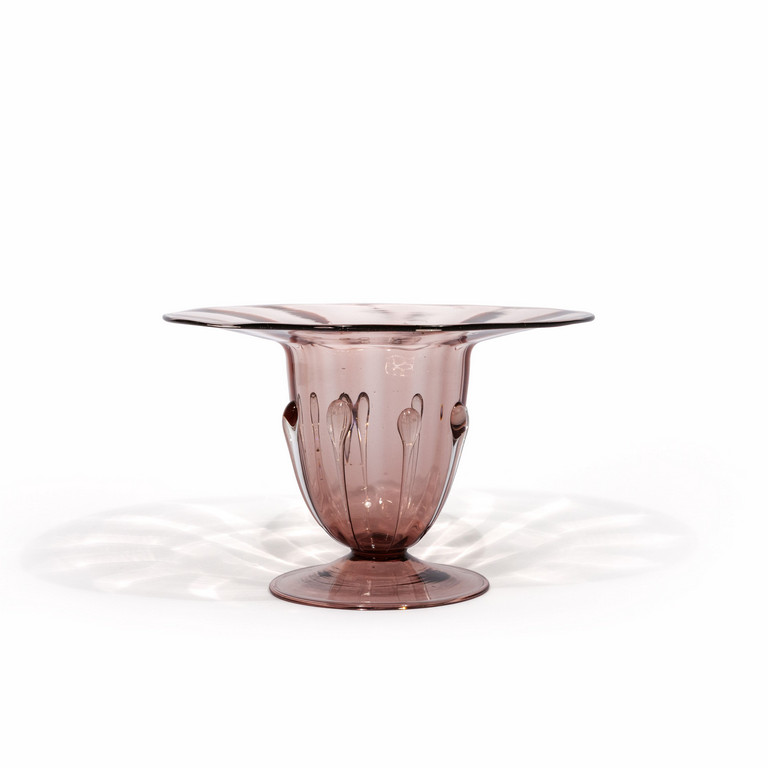 Una coppa in vetro trasparente ametista chiaro con decoro di goccioloni.