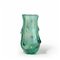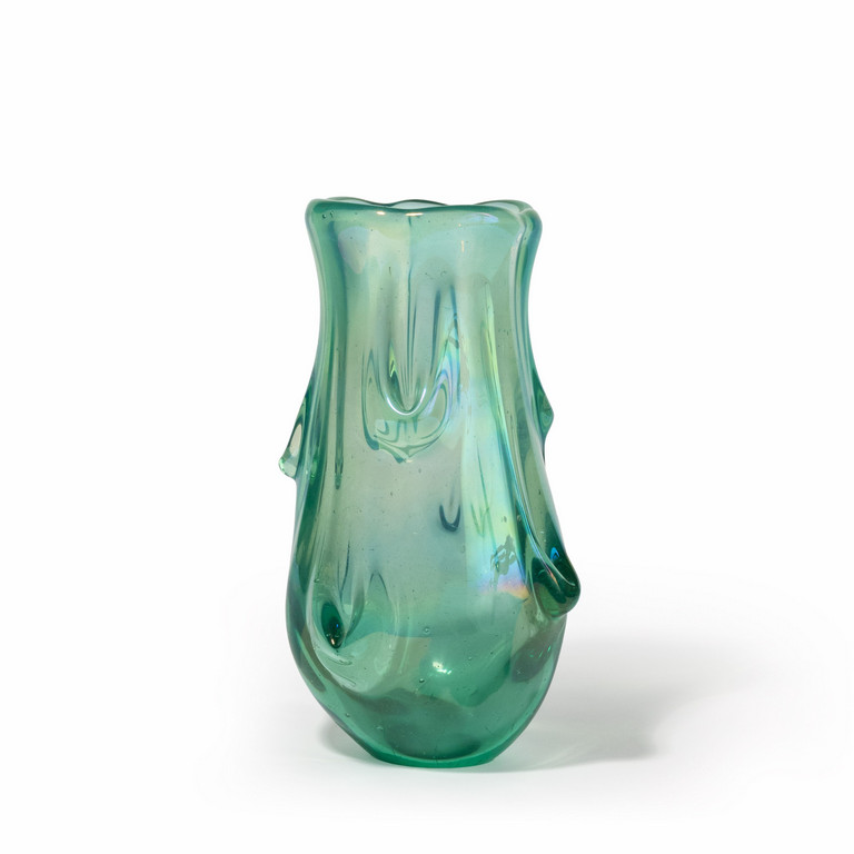 Un vaso in vetro trasparente verdino iridato con decoro a rilievi.