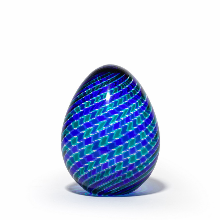 Un uovo in vetro a canne blu e verdi ritorte.