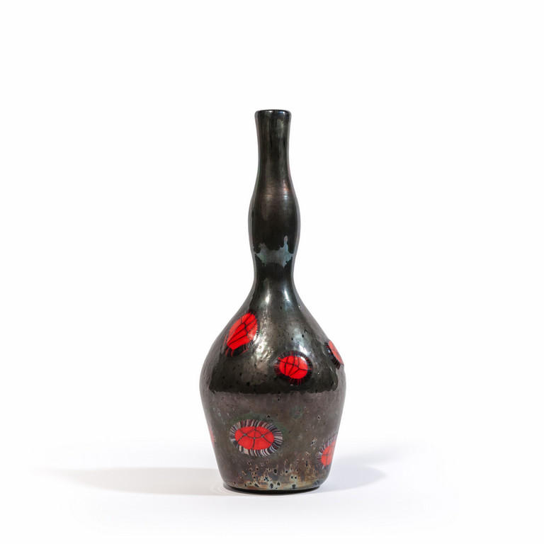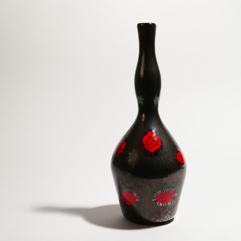 Una bottiglia 'nerox' con decoro di murrine rosse sparse.