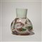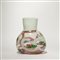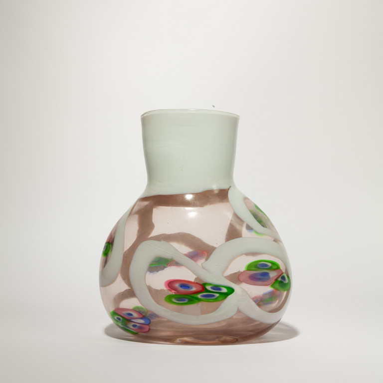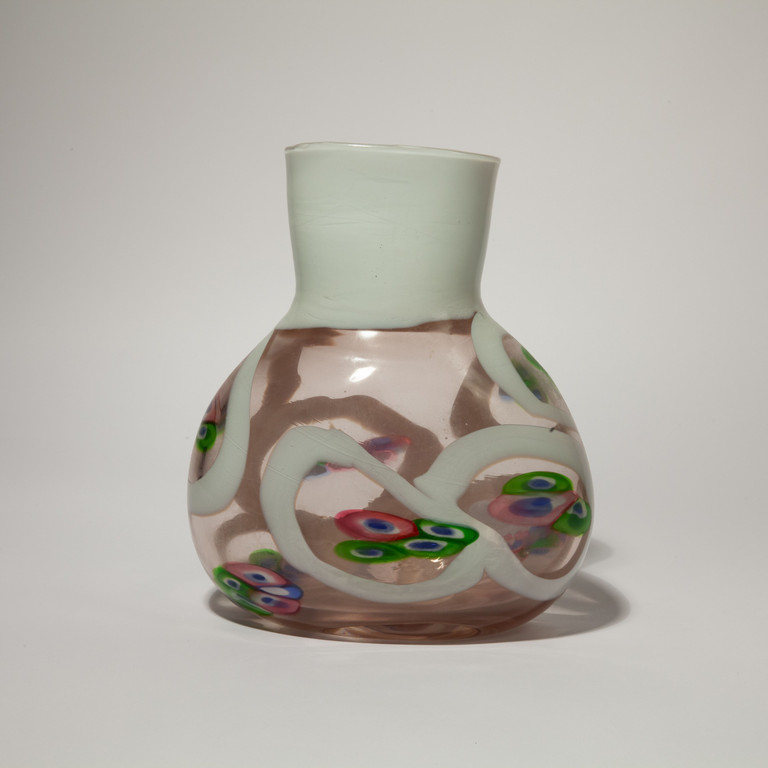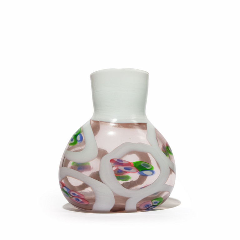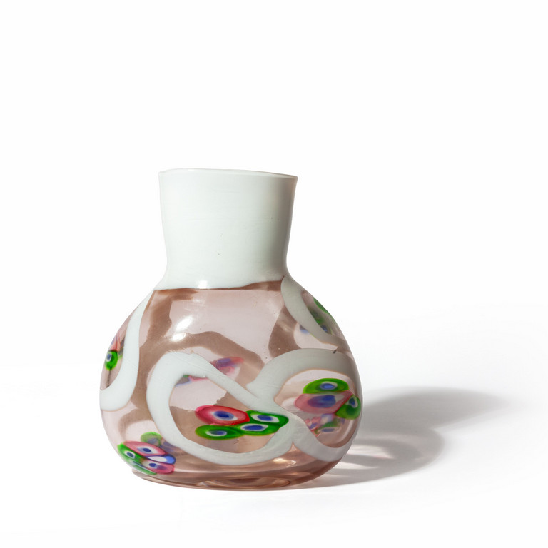Un vaso a forma ovale in vetro trasparente rosa con collo fasciato di lattimo e decoro di