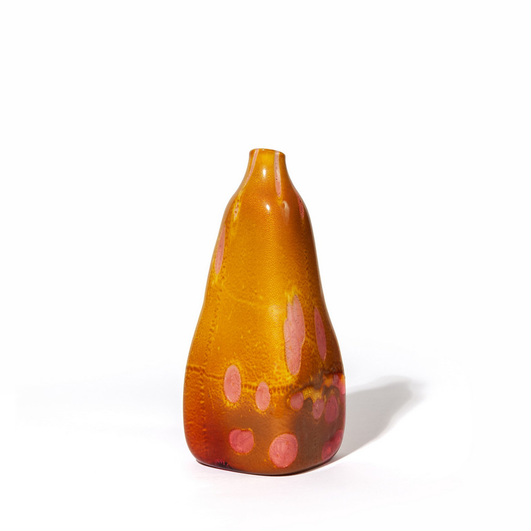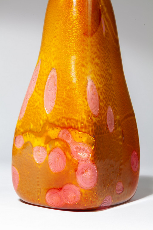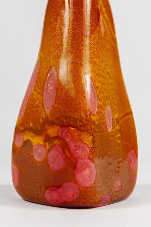 Un vaso a 'reazioni policrome' con murrine sparse a filigrana rubino.