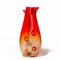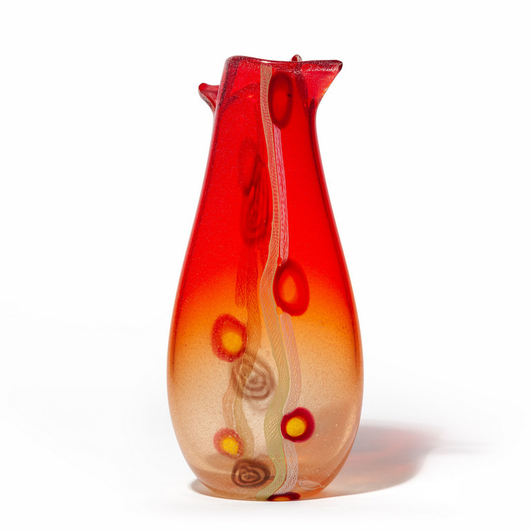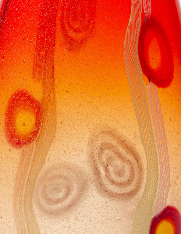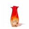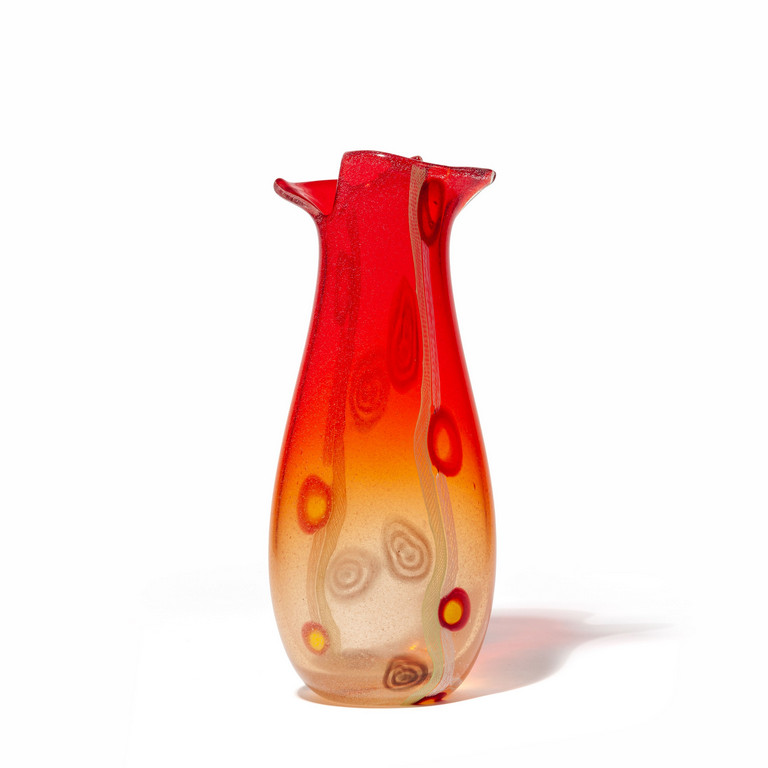 Un vaso in vetro trasparente a bollicine rosso sfumato con due canne di reticello in verticale