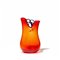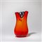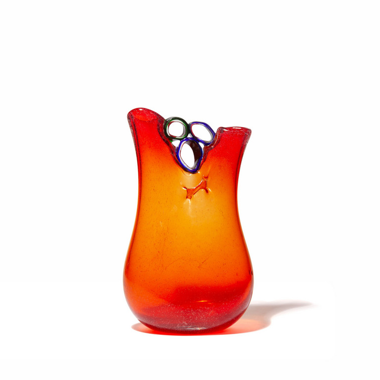 Un vaso a due colli in vetro rosso a bollicine e applicazione di tre anelli fra i colli.