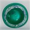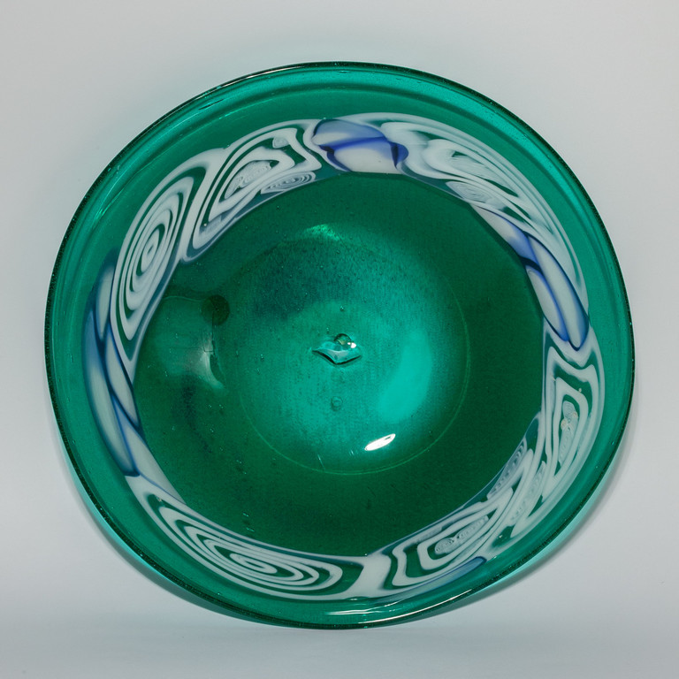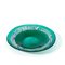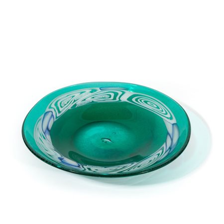 Un piatto in vetro trasparente verde a bollicine con grosse murrine concentriche lattimo e