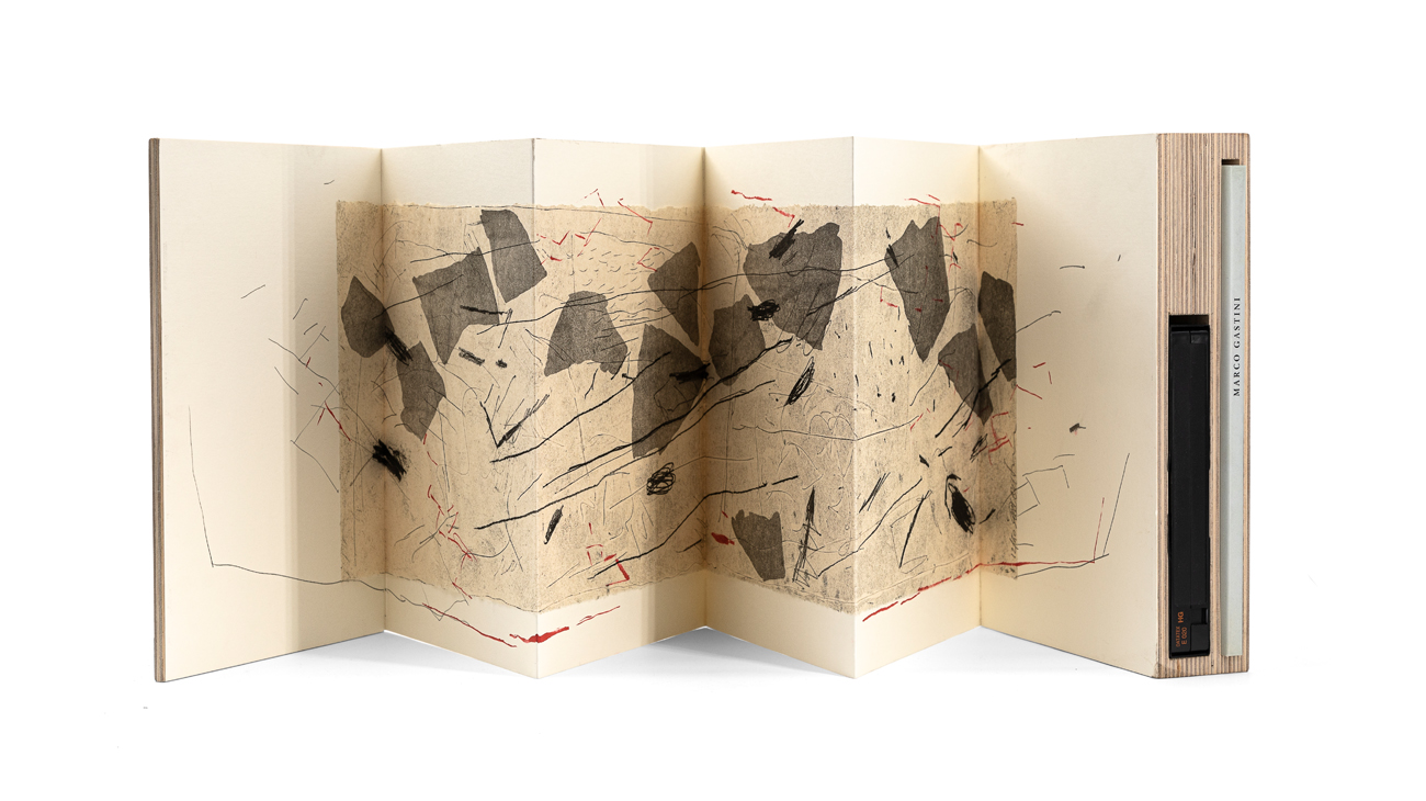 - un'incisione originale ad acquatinta e vernice molle, ripiegata su 6 pagine, stampata a mano con torchio a stella su carta di riso giapponese recante firma e numerazione (Esemplare 12/50) a matita al fronte