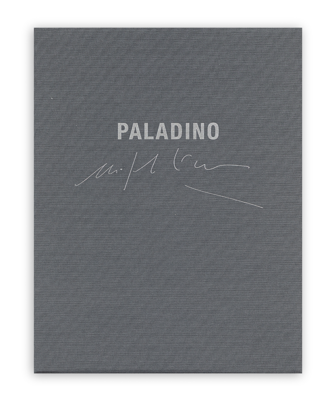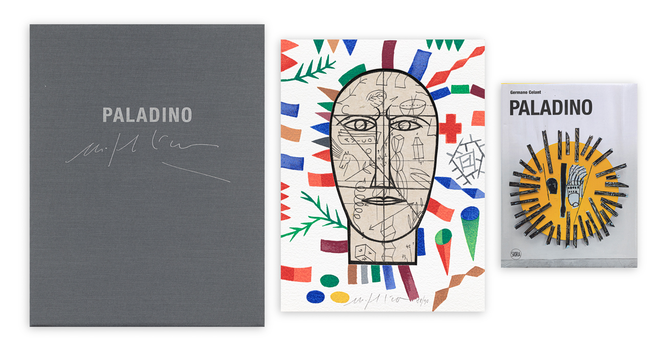 Entro cofanetto originale in cartone rigido foderato comprensivo di colophon di presentazione numerato e volume 'Paladino' a cura di Germano Celant (Skira Edizioni)