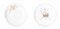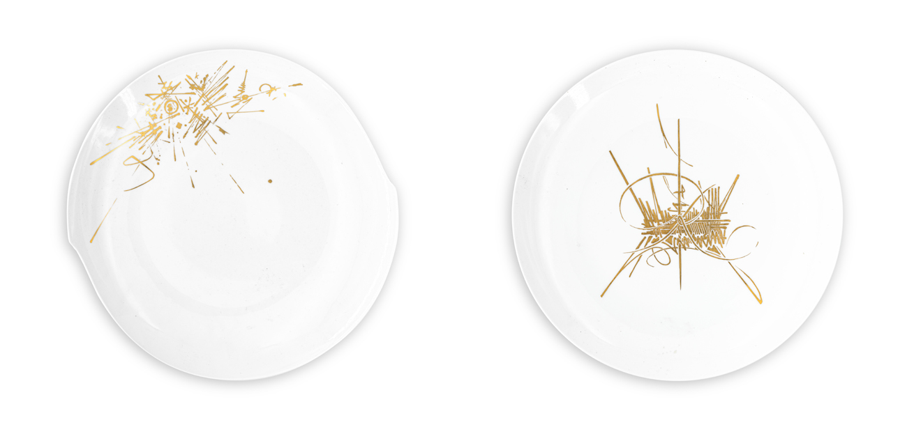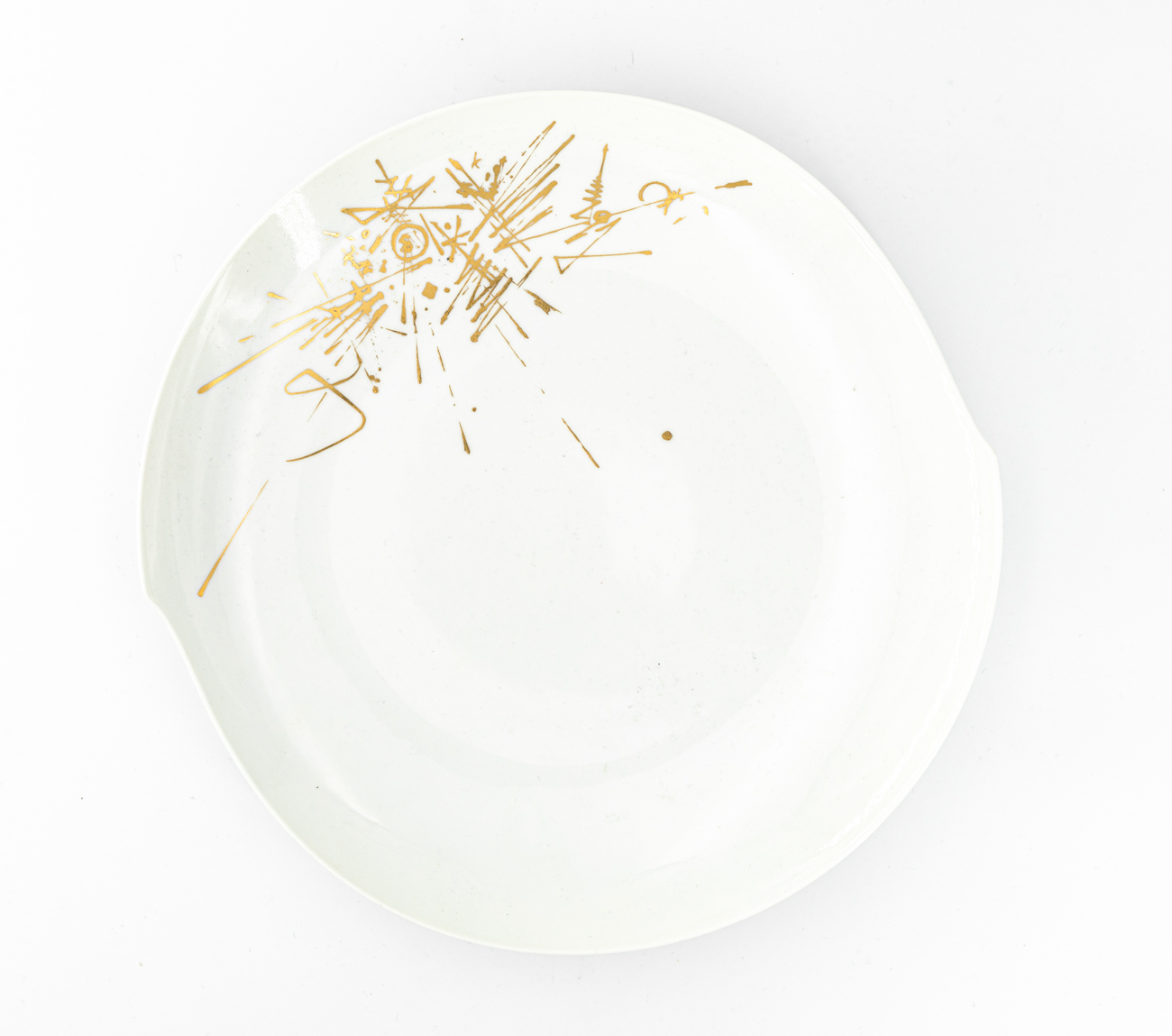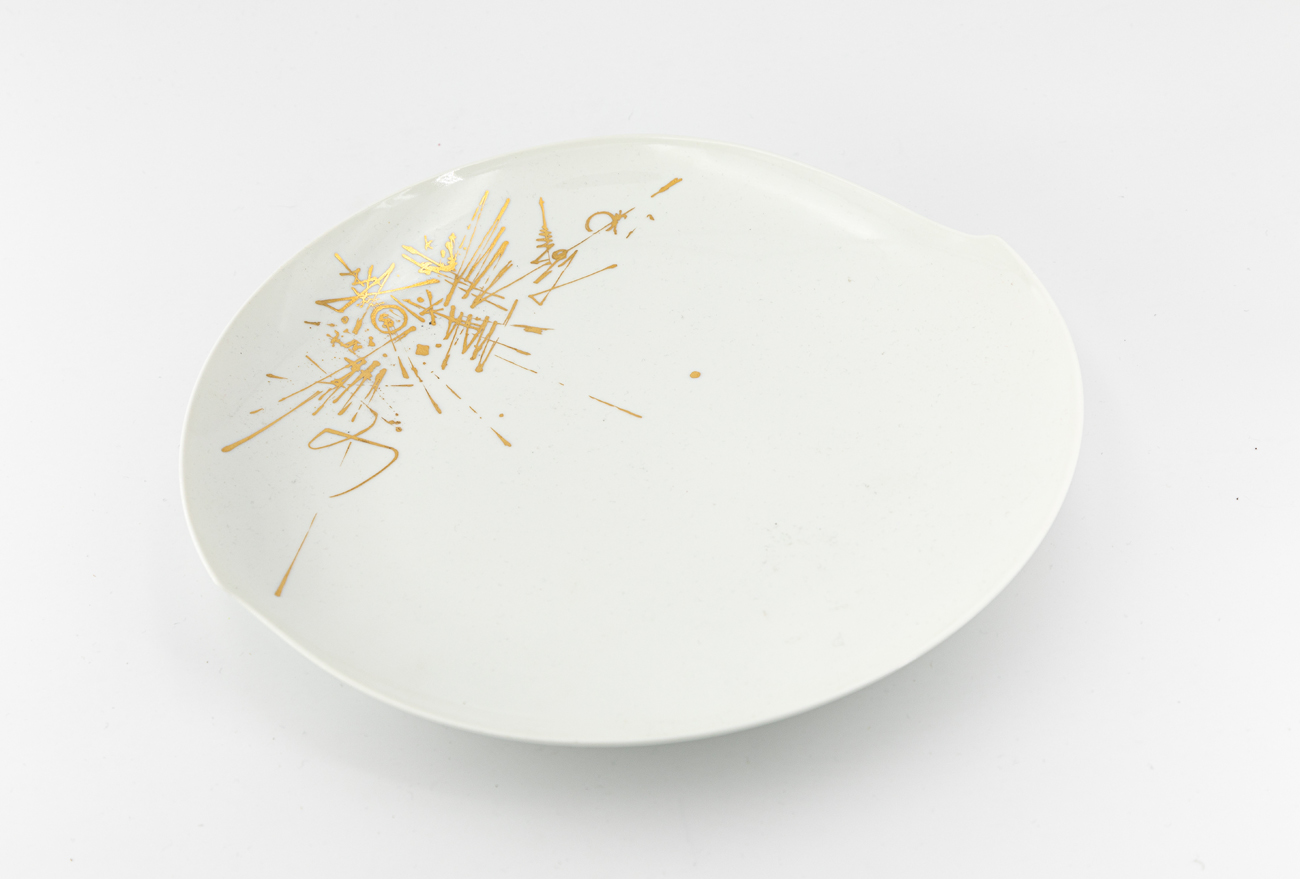 Lotto unico di 2 piatti in porcellana smaltata bianca con decorazioni in oro, di cui uno recante bordi sagomati