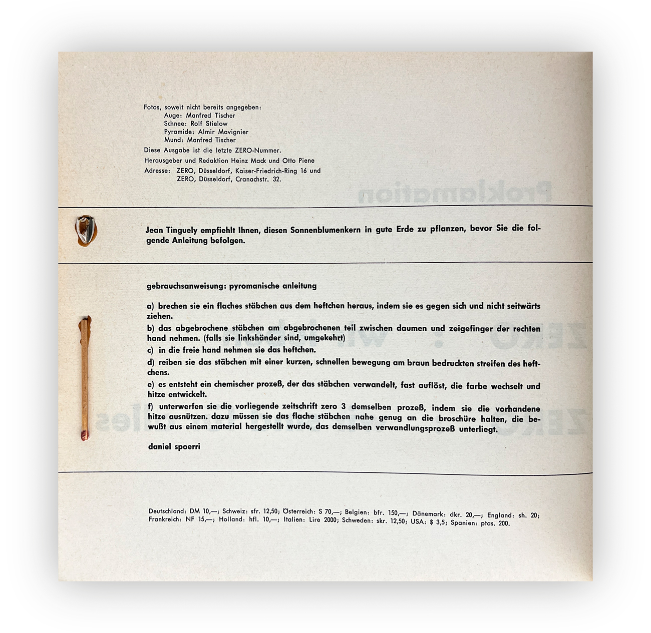 Terzo e ultimo numero del famoso periodico del gruppo ZERO che include vari interventi di artisti tra cui Fontana, Klein, Piene, Mack, Arman, Manzoni, Spoerri, Tinguely, Castellani, Uecker, Aubertin, Rainer