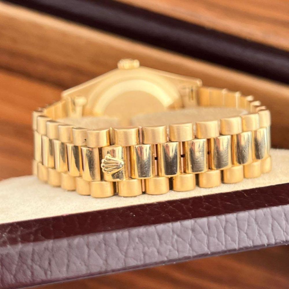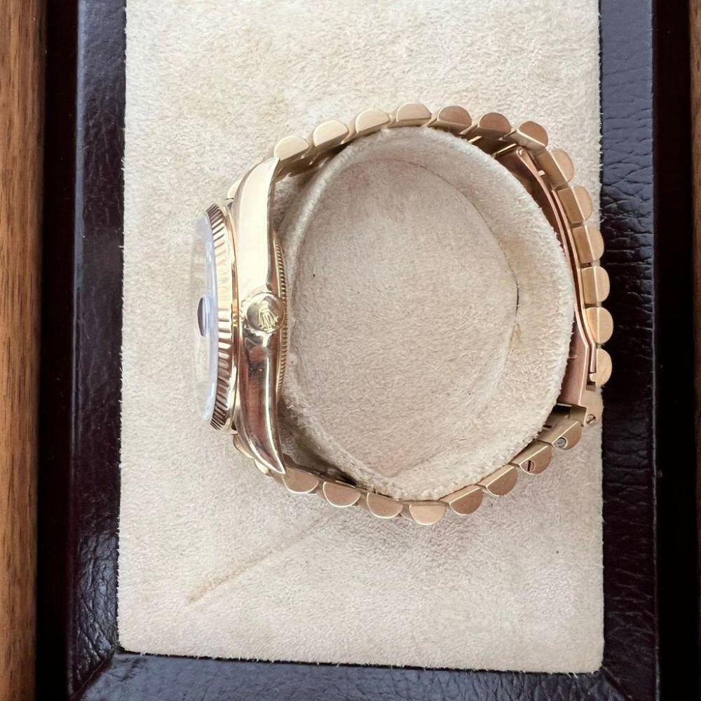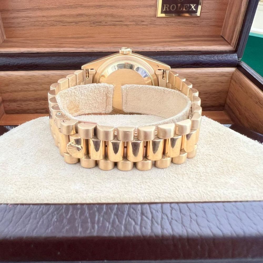 Marca Rolex Modello (Orologio) Day-Date 36 Numero di referenza 18238 Carica Automatico Materiale della cassa Oro giallo Materiale cinturino Oro giallo Anno di produzione 1997 garanzia Rolex, no box Materiale della cassa Oro giallo Diametro 36 mm Impermeabile 10 ATM Materiale lunetta Oro giallo Vetro Vetro zaffiro Cinturino Materiale cinturino Oro giallo Colore cinturino Oro Materiale chiusura Oro giallo