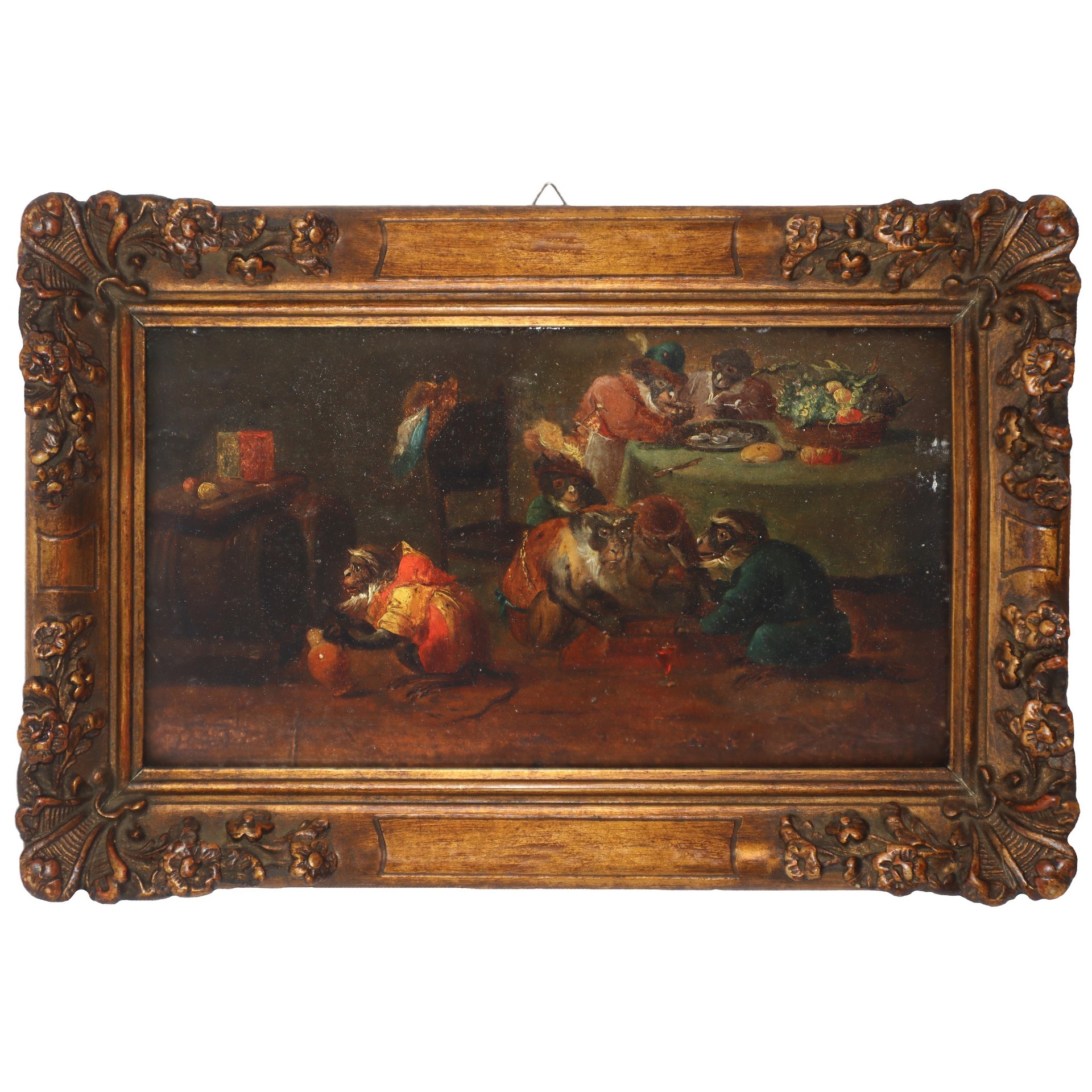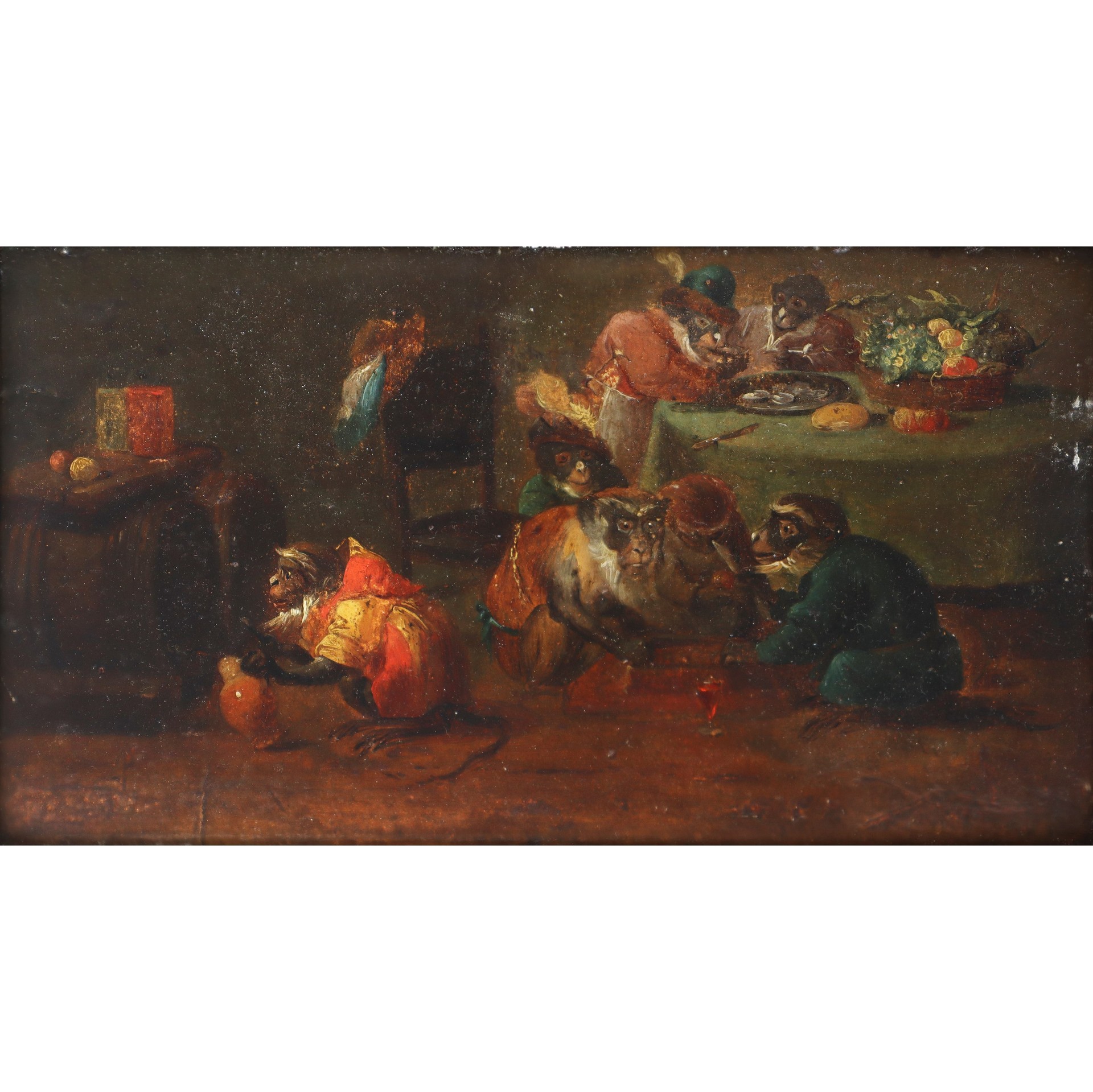 David Teniers il Giovane (attribuito a) (Anversa 15/12/1610-Bruxelles 25/04/1690) - Il banchetto delle scimmie, 17° secolo
