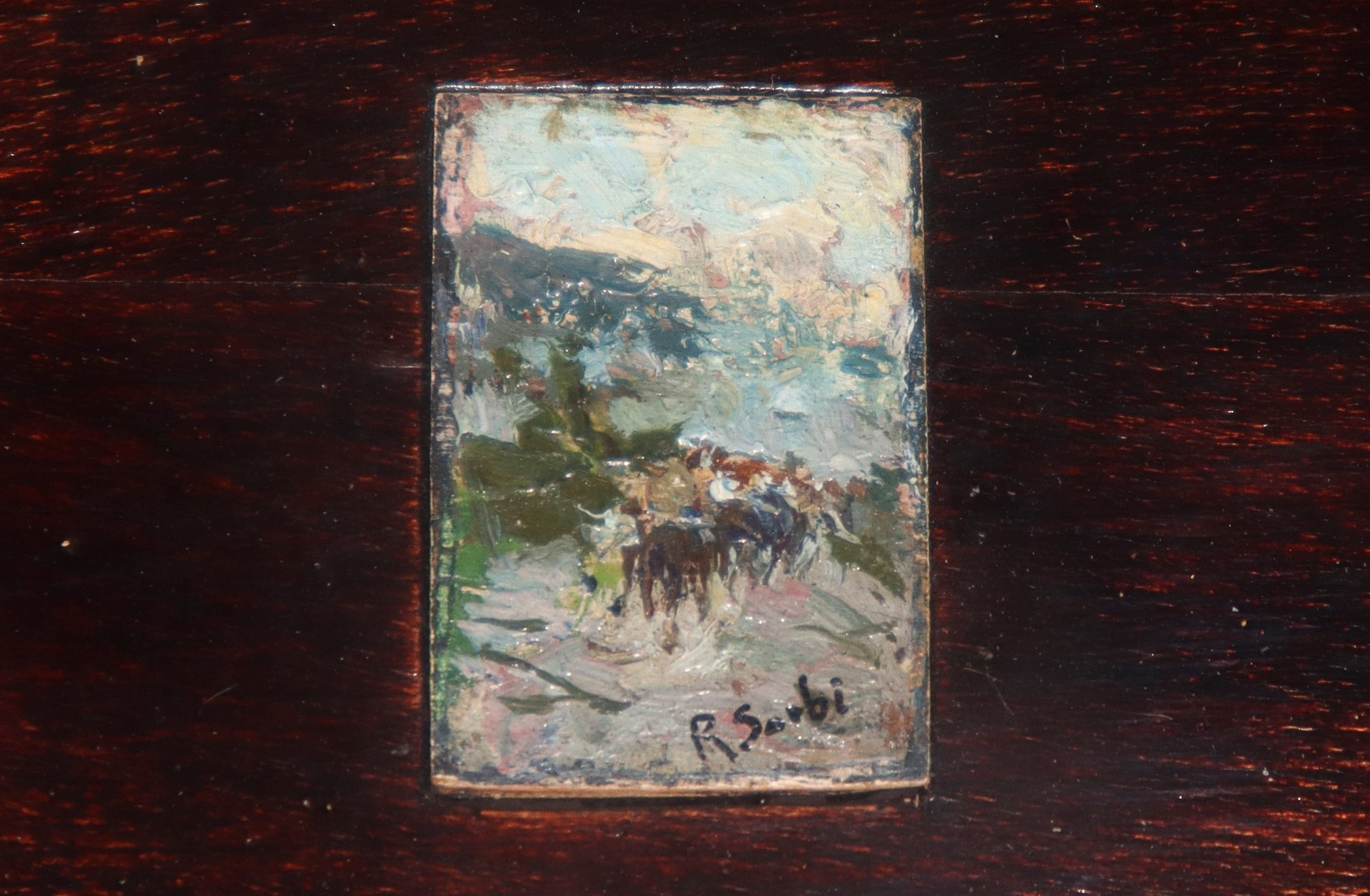 Raffaello Sorbi (Firenze 1844-Firenze 1931) - 3 miniature raffiguranti uomini a cavallo cm 2,5x1,5 ognuna, in cornice cm 23x33 Ex Galleria Parronchi, Milano. Sul retro autenticaEx Galleria Parronchi, Milano. Sul retro autentica