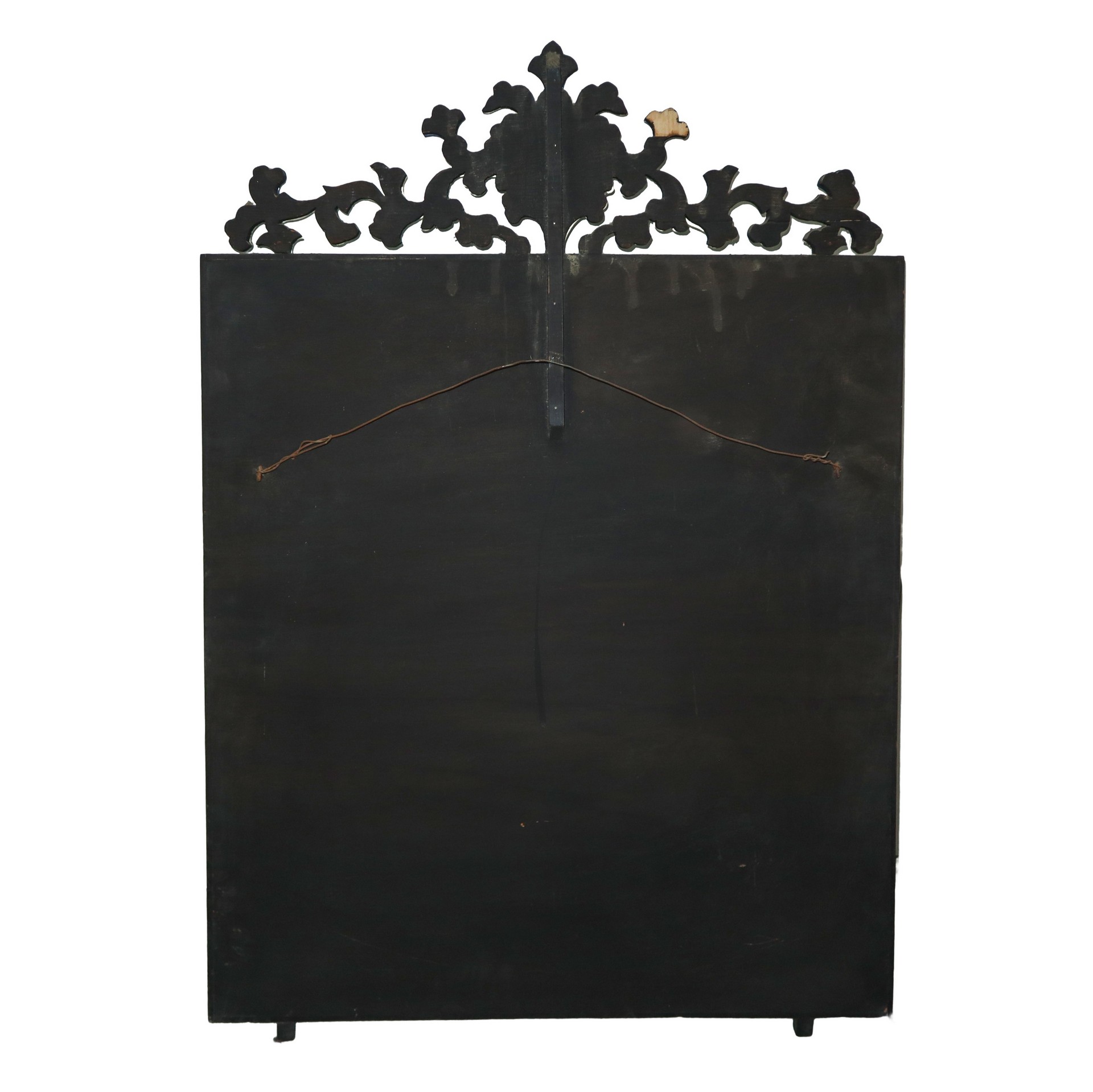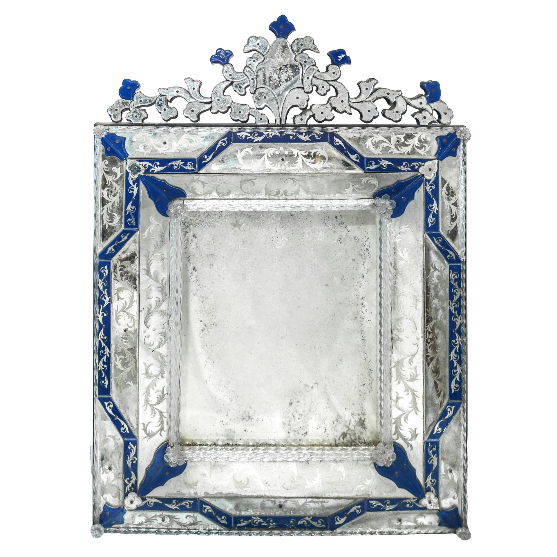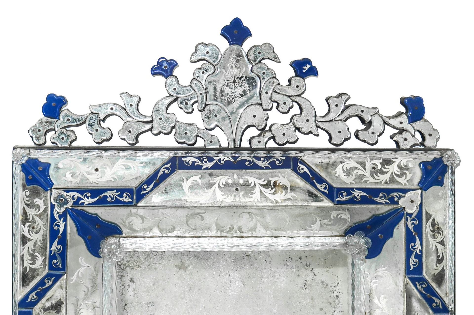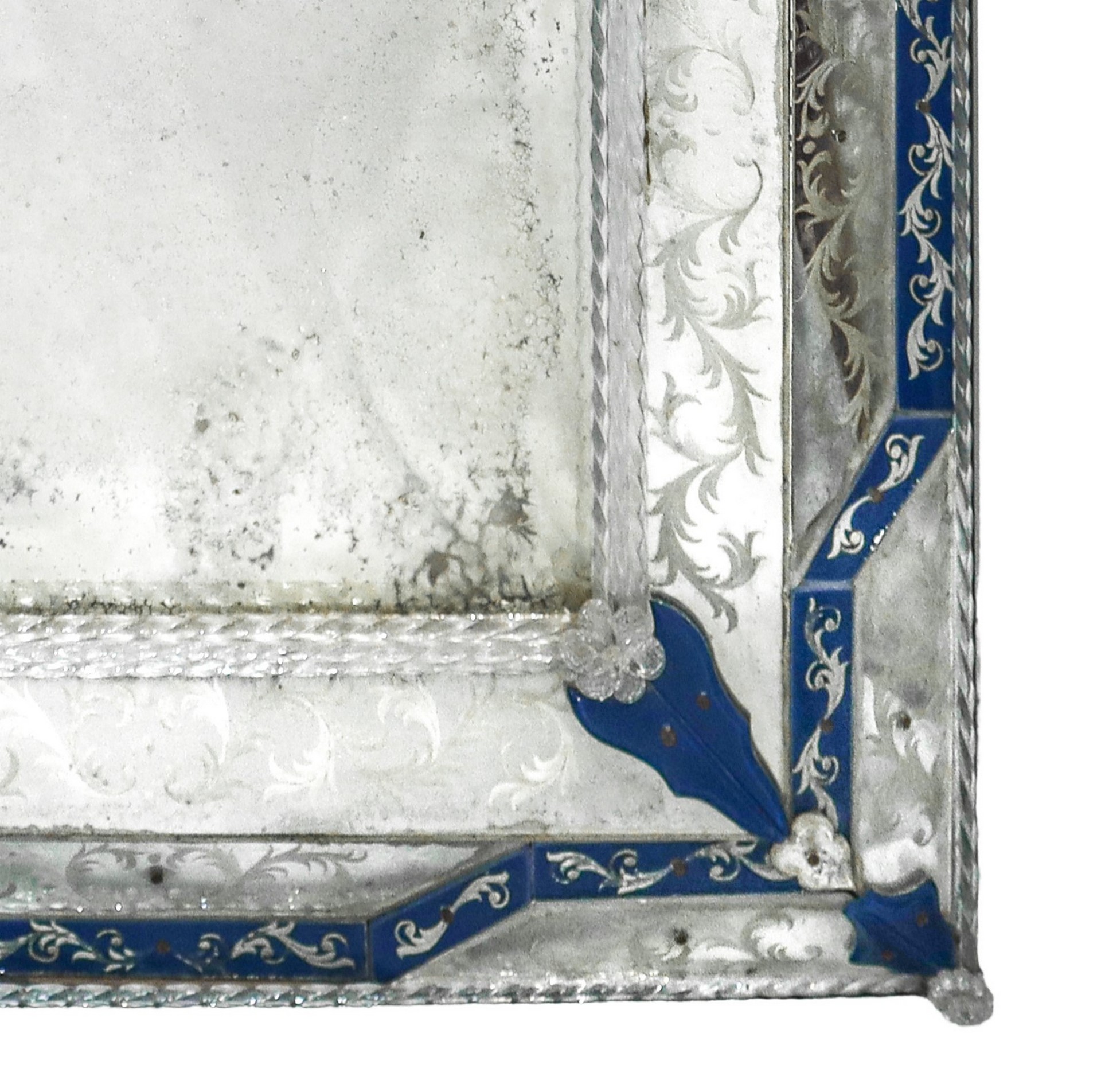Specchio in vetro di Murano bulinato H cm 93x65 Fine XIX secolo Intagliato e soffiato. Presenta particolari in blu.