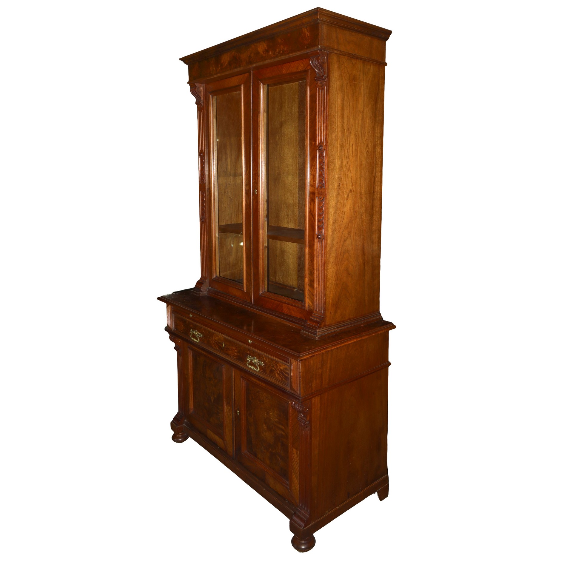 Credenza a due corpi in radica di noce, fine 19° secolo H cm 205x115x58 Corpo superiore a due ante a vetri, tiretto alla base, corpo inferiore con due sportelli. Lesene applicate ai lati con capitelli in legno integliato.Corpo superiore a due ante a vetri, tiretto alla base, corpo inferiore con due sportelli. Lesene applicate ai lati con capitelli in legno integliato.