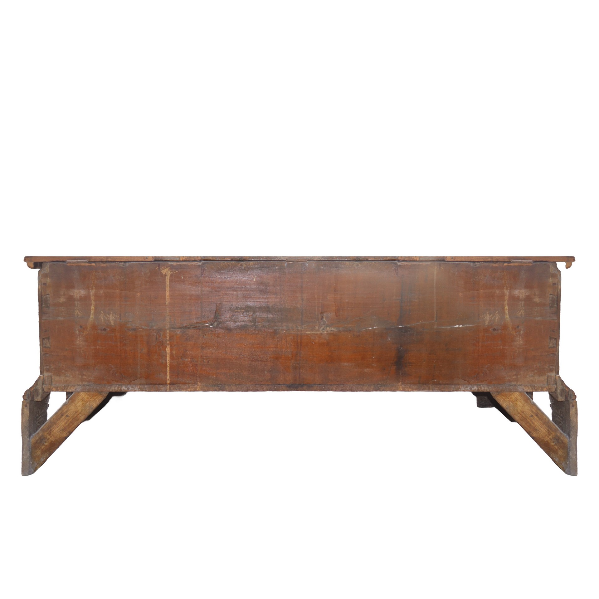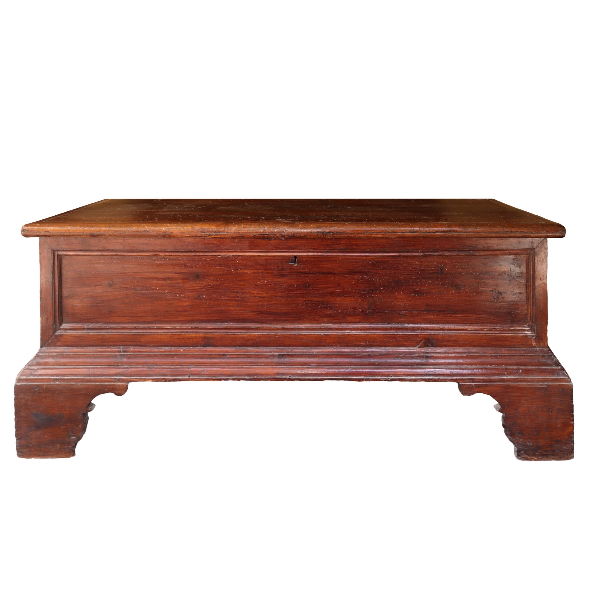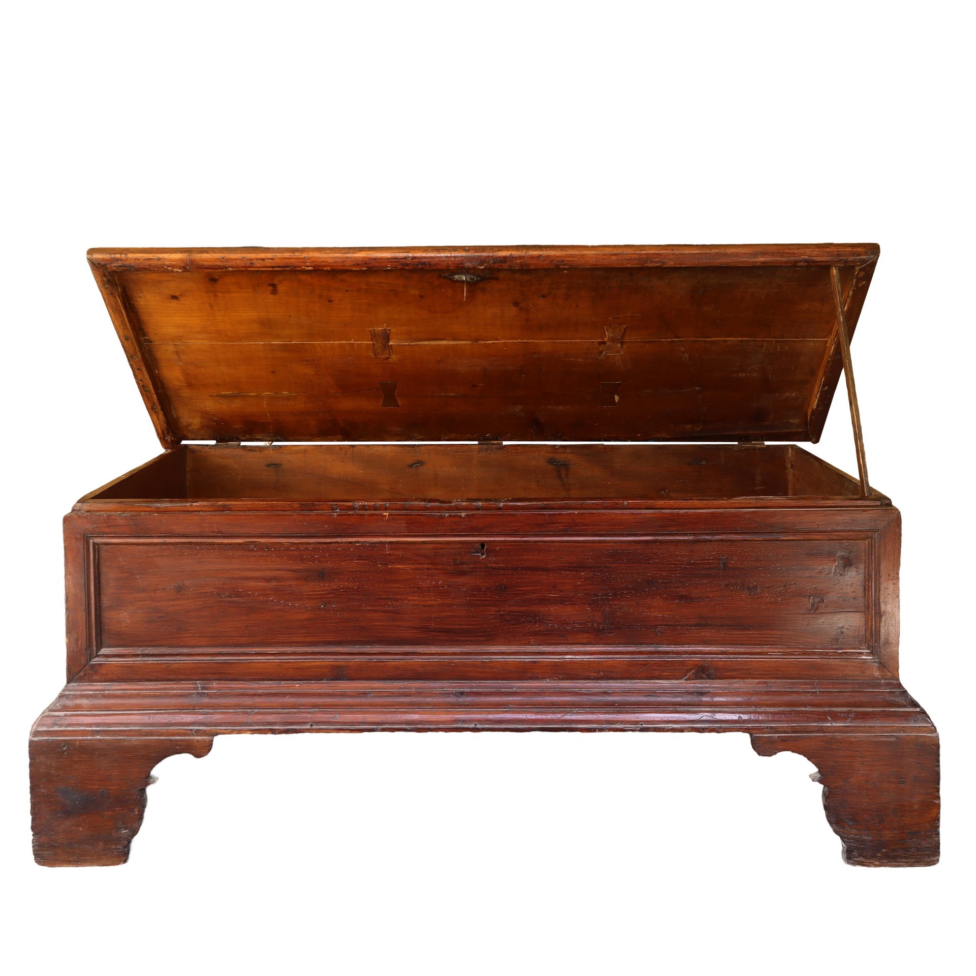 Cassapanca in legno di abete, nineteen° secolo H cm 72x175x65 Coperchio con bordi a bacucco, cornici a degradare, piedi a mensola.Coperchio con bordi a bacucco, cornici a degradare, piedi a mensola.