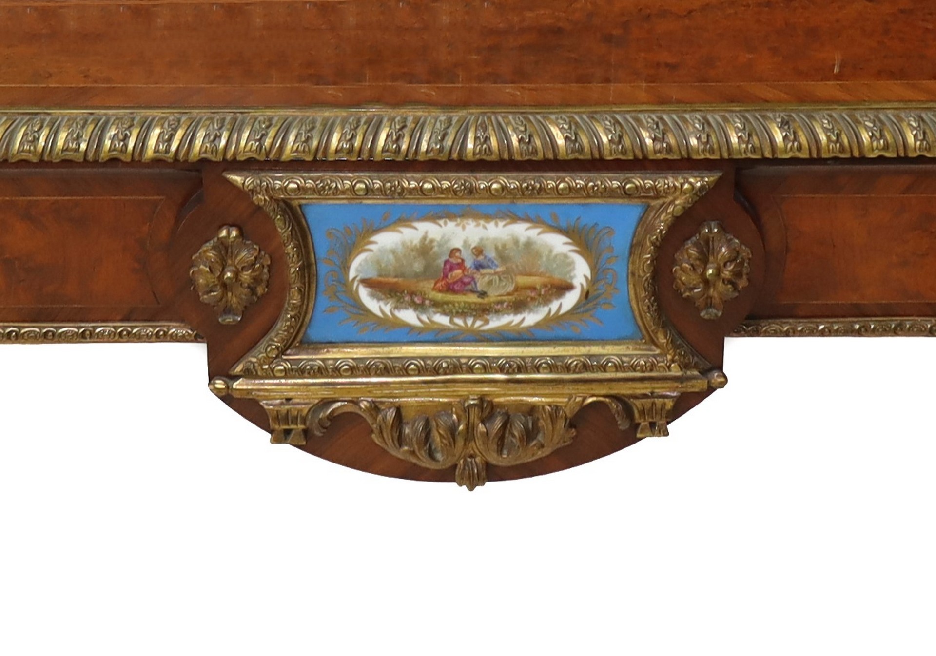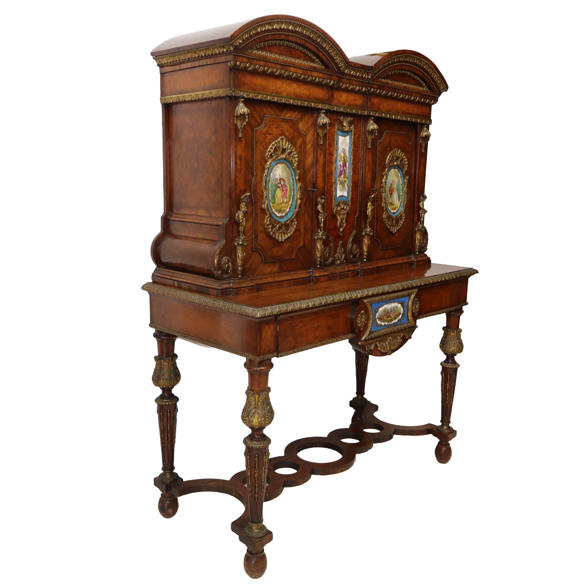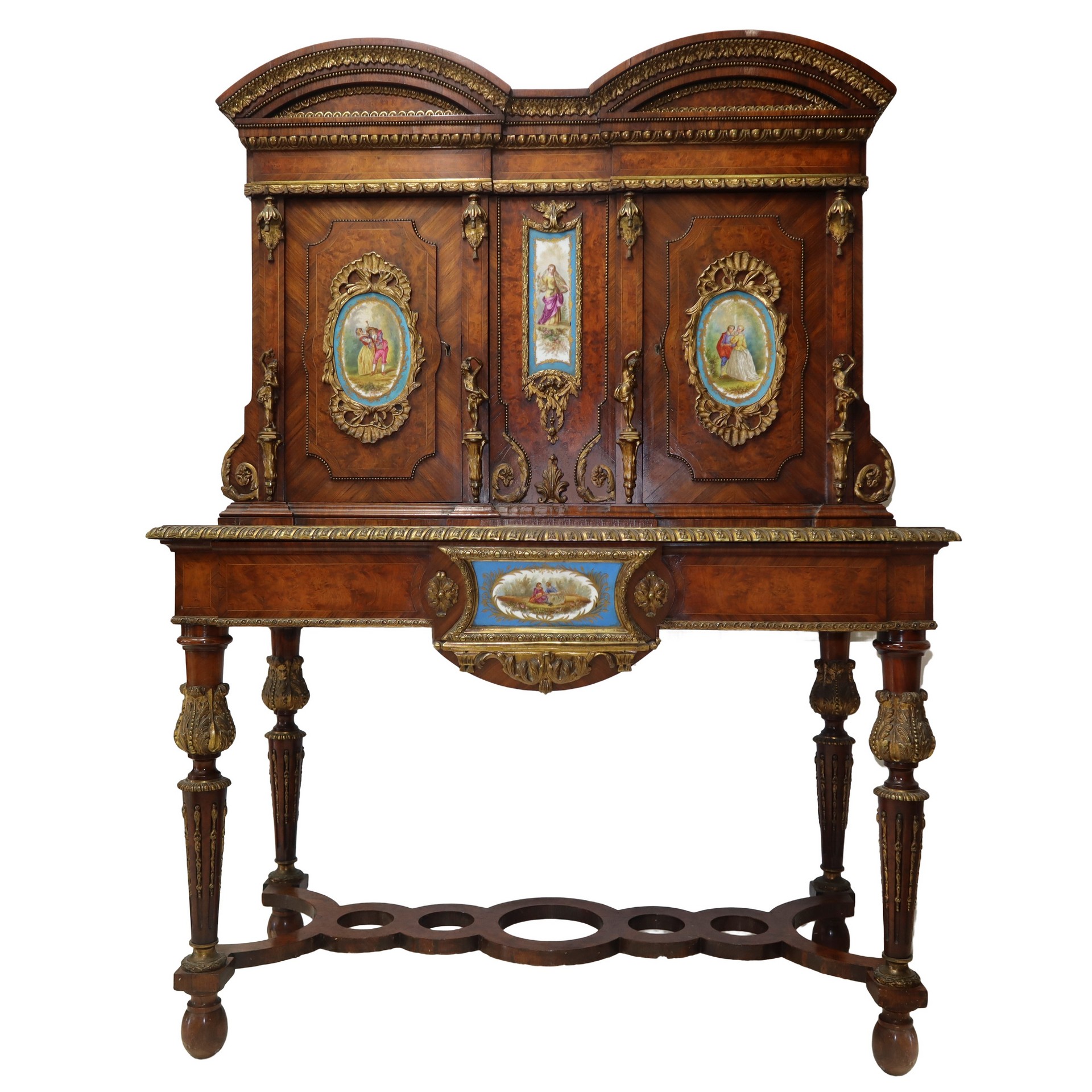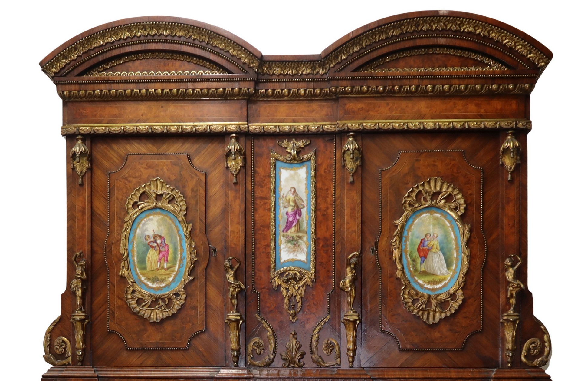 Mobile cabinet a due corpi, Napoleon III, France 19° secolo h 144 cm, L 105, P 49 Con applicazione di ceramiche Sevres con raffigurazione di scene di genere, applicazioni di bronzi dorati alle cornici perimetrali ai piedi e agli sportelli superioriCon applicazione di ceramiche Sevres con raffigurazione di scene di genere, applicazioni di bronzi dorati alle cornici perimetrali ai piedi e agli sportelli superiori