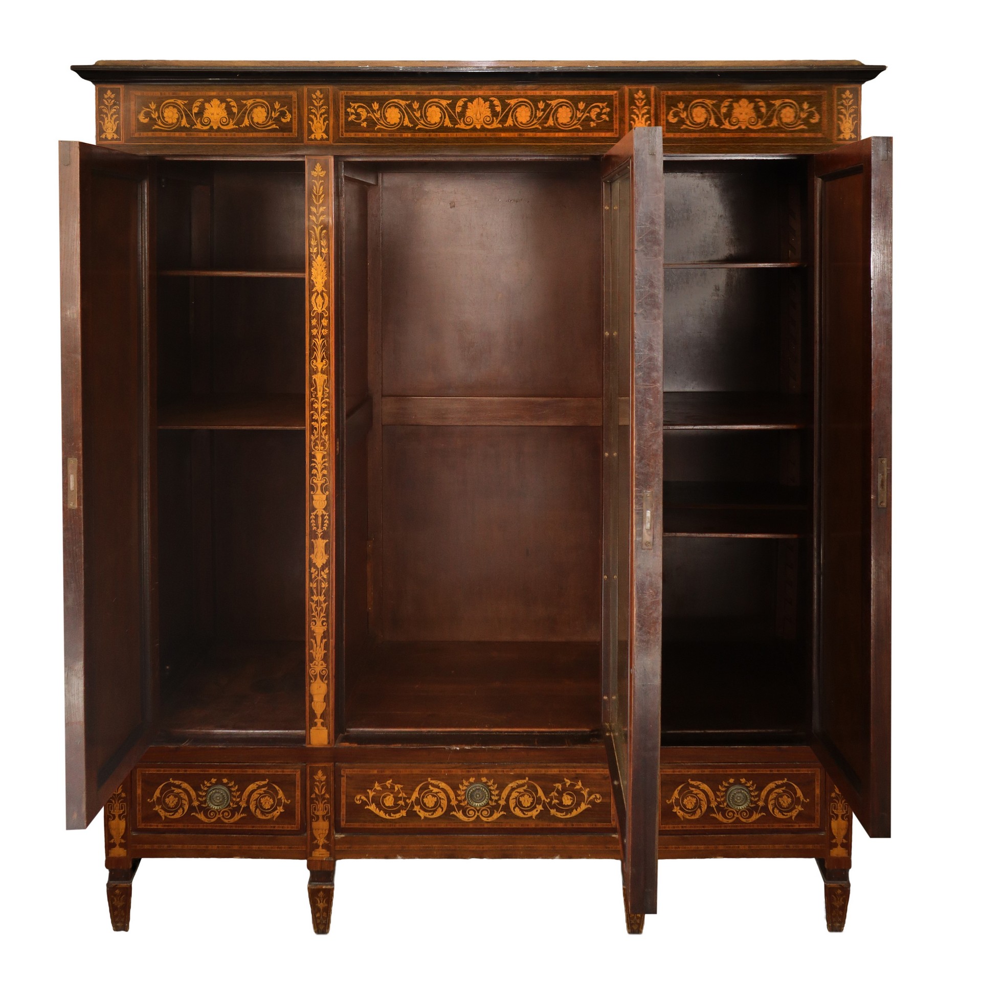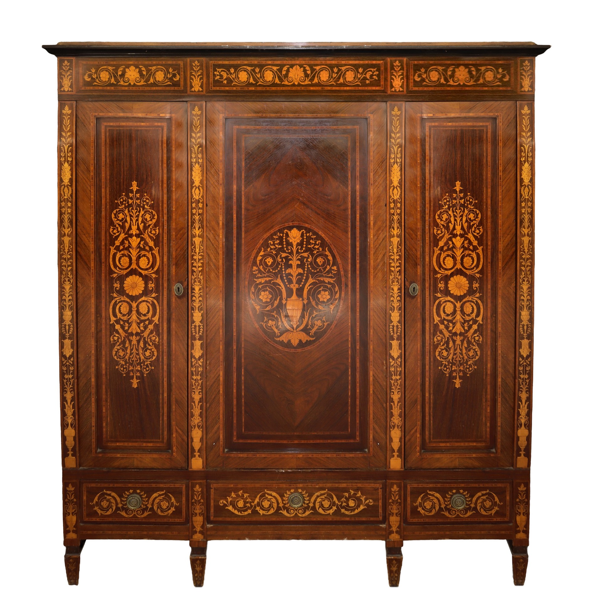 Armadio intarsiato, a tre ante, nineteen° secolo H cm 180x158, profondità cm 58 Con intarsi pregevoli in legni chiari sul fronte e sui lati, piedi troncopiramidali e cassetti alla baseCon intarsi pregevoli in legni chiari sul fronte e sui lati, piedi troncopiramidali e cassetti alla base