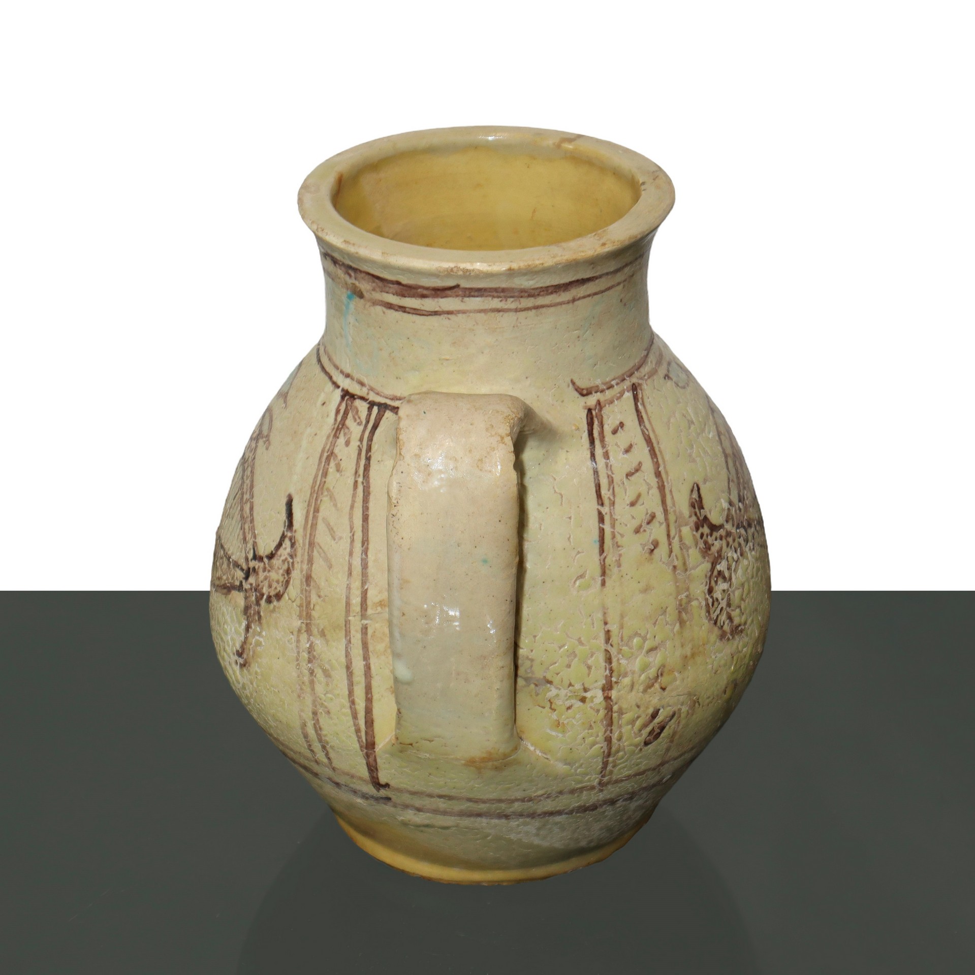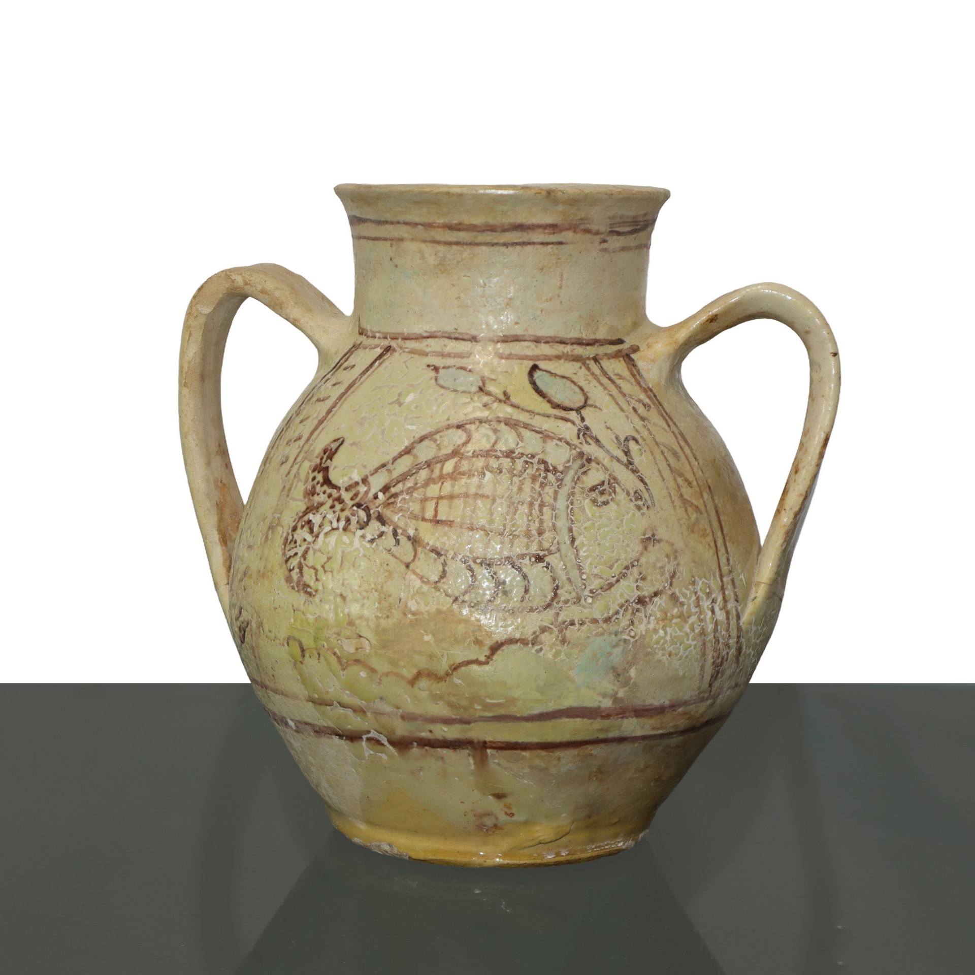 Bocciolo in ceramica biansata invetriata, con la raffigurazione di due pesci contrapposti, Central Italy, XIV H cm 18 Decorato verderame e manganese. Piccoli restauri Decorato verderame e manganese. Piccoli restauri