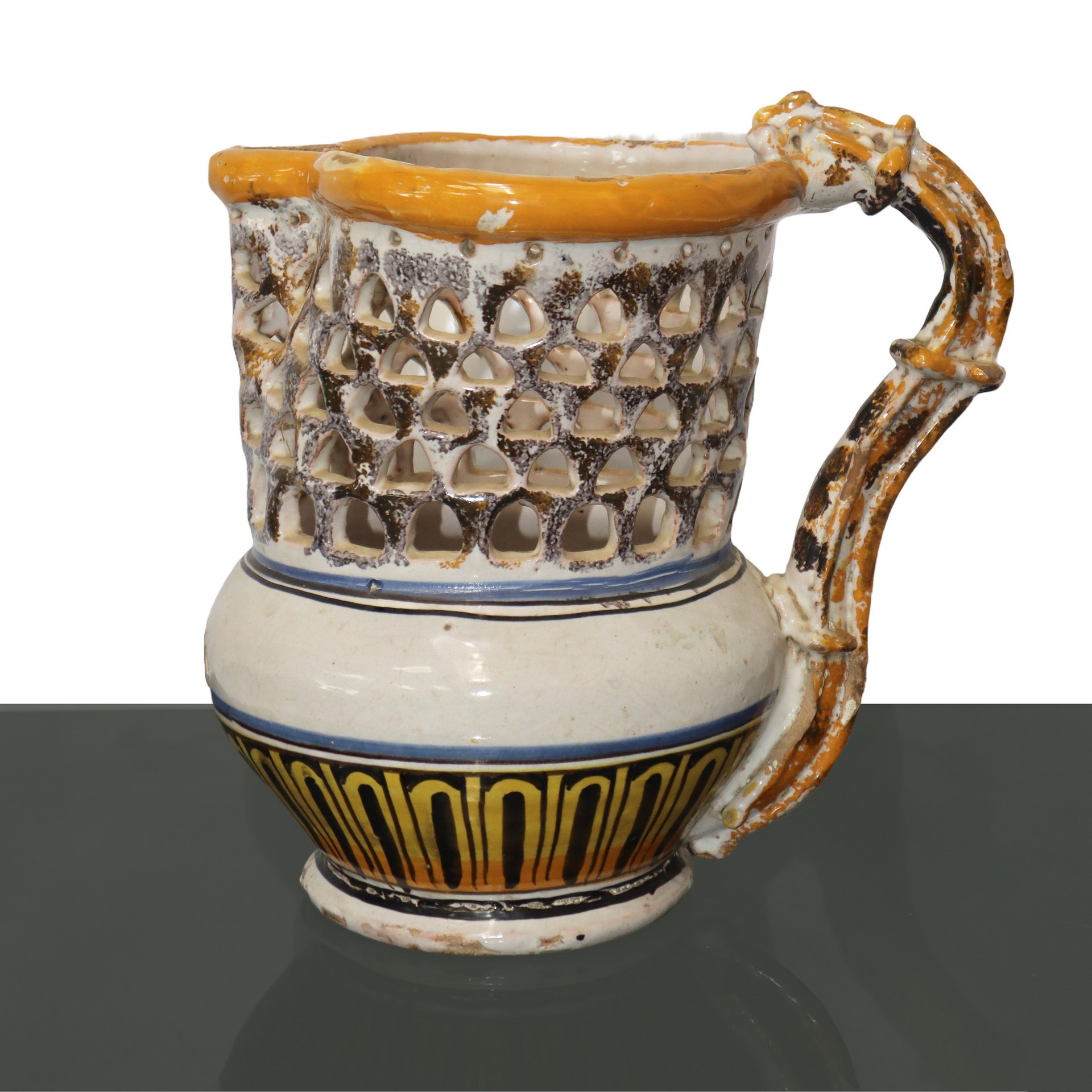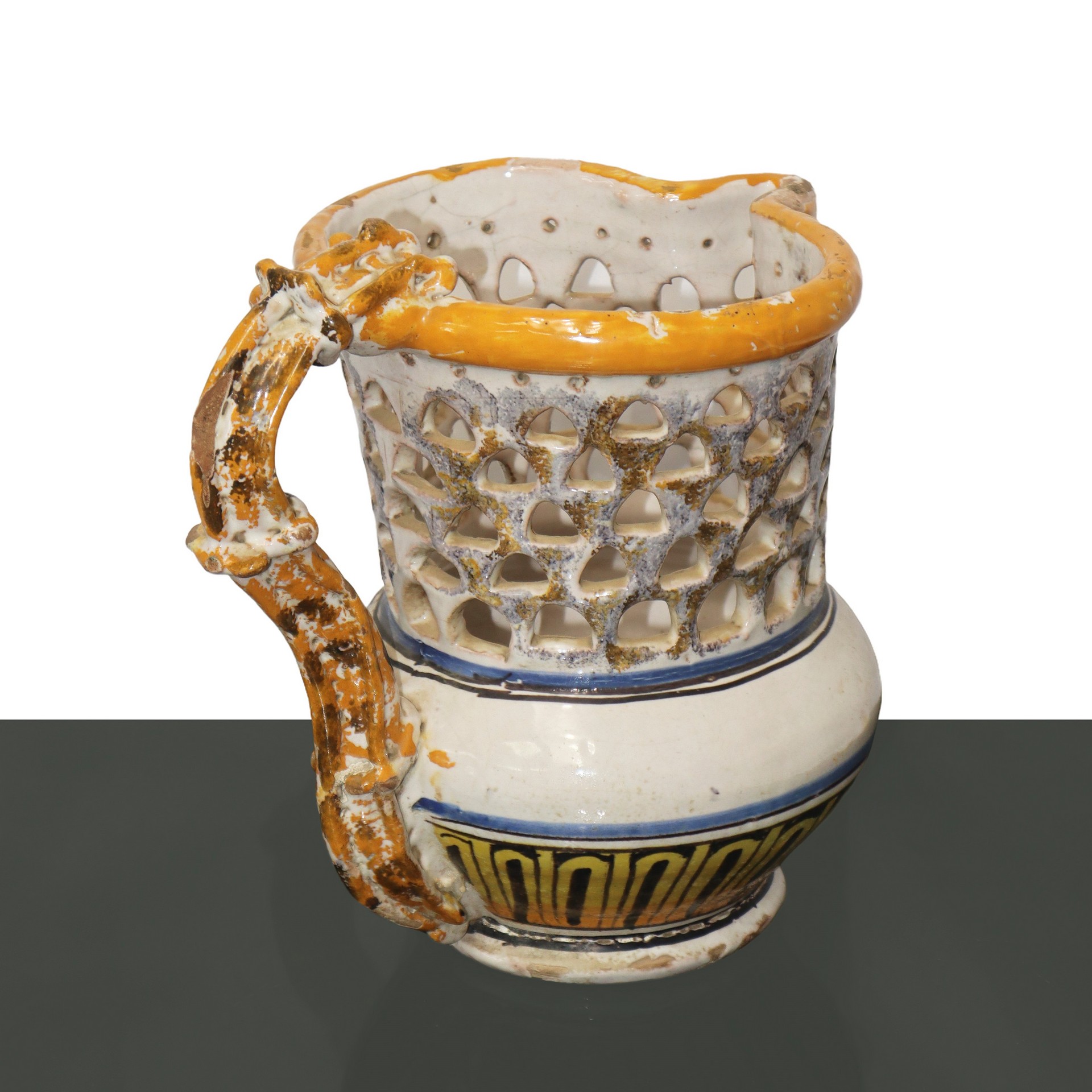 Versatoio traforato in maiolica policroma “bevi se puoi”, Laterza (Puglia), fine 18° secolo