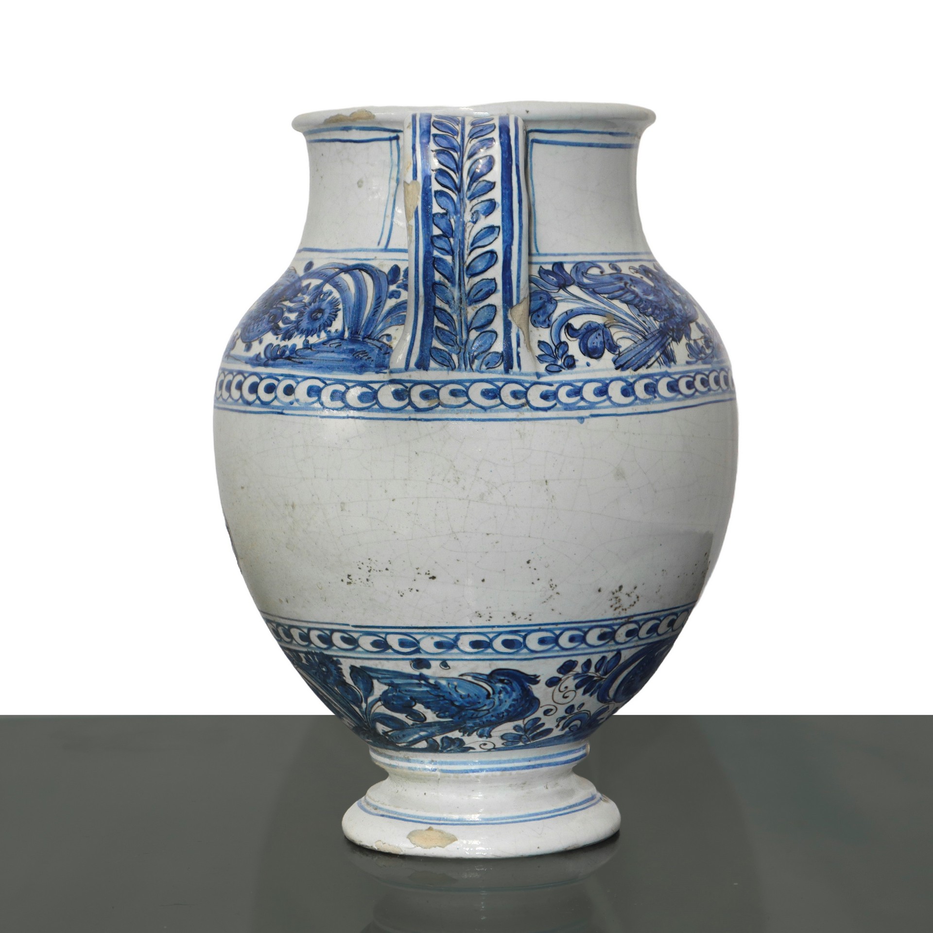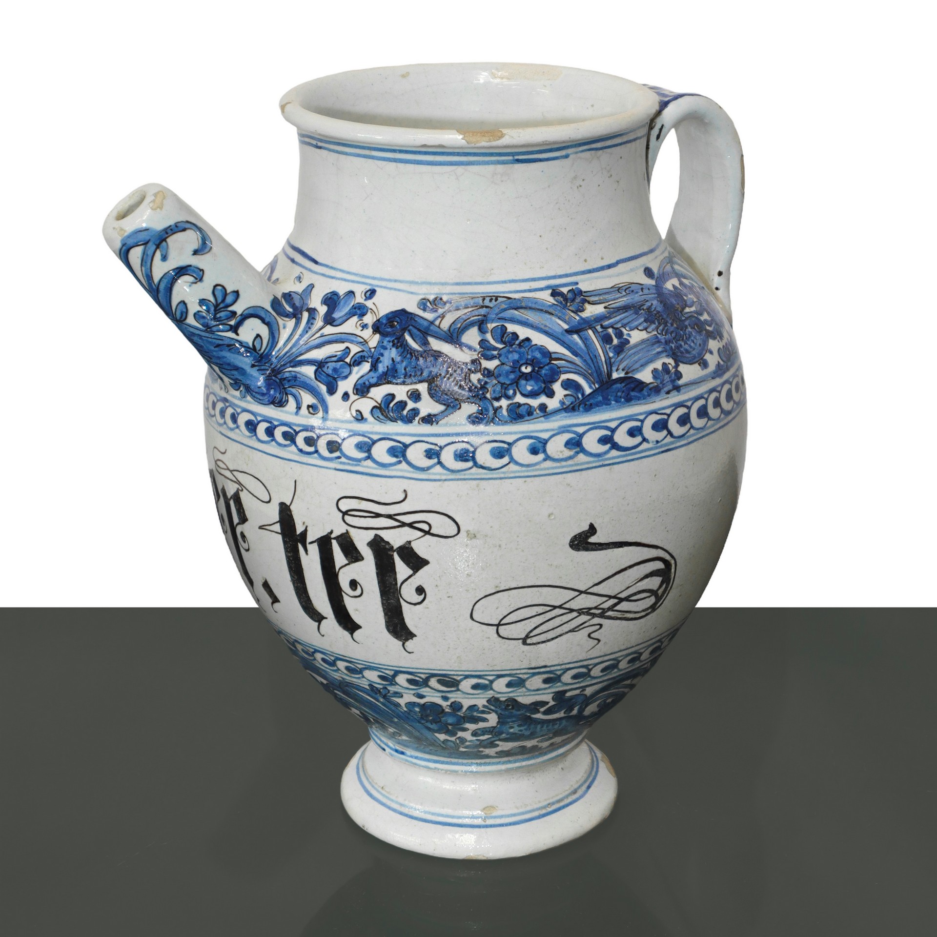 Versatoio in maiolica in turchese con animali tra viticci e fiori. , Savona, fine 17° secolo cm 24x21 Iscrizione farmaceutica al centro. Iscrizione farmaceutica al centro.